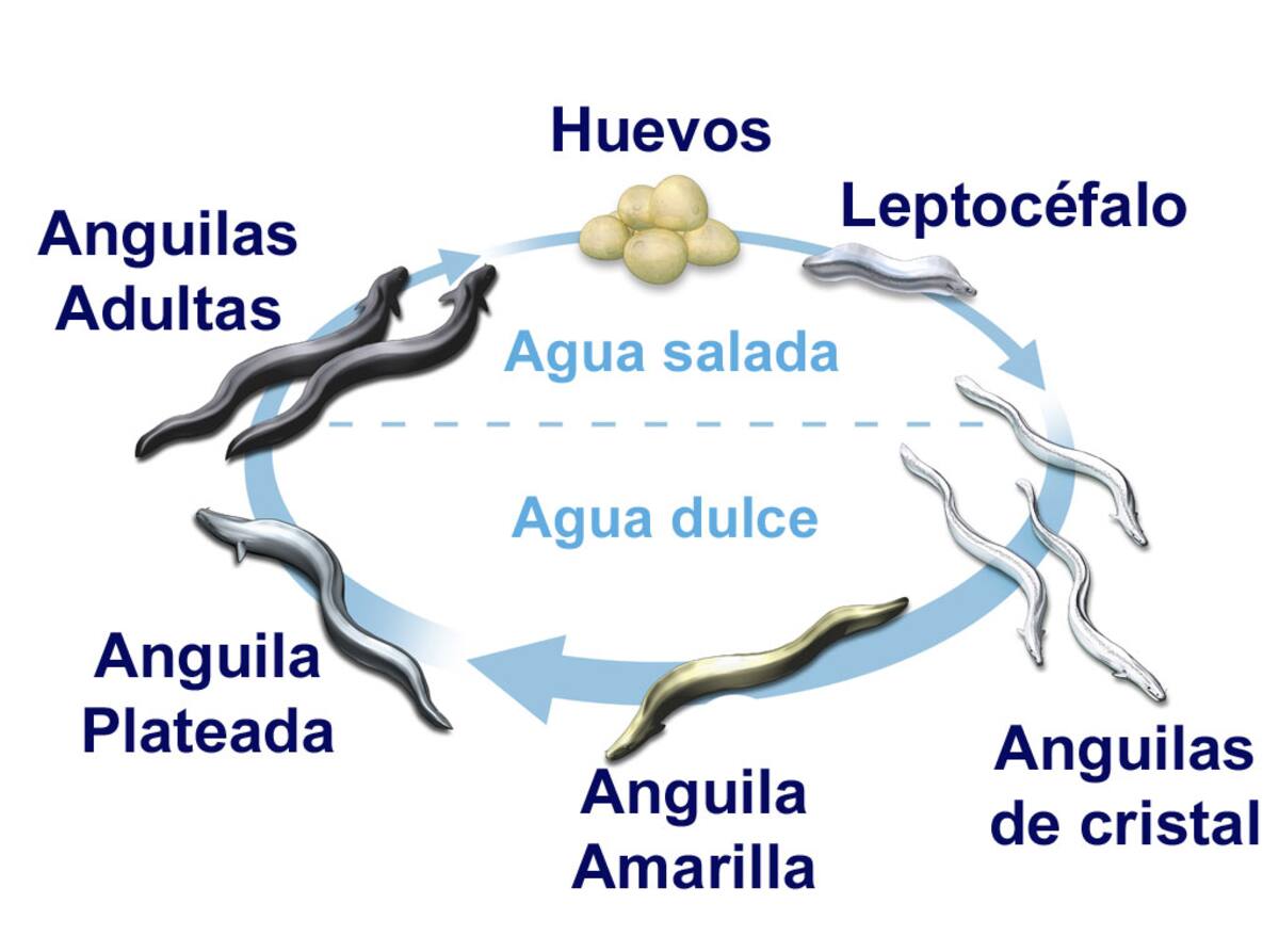 Hoy sabemos que el ciclo de vida de las anguilas consta de cinco etapas: larvas leptocéfalas, angulas, angulones, anguilas amarillas y anguilas plateadas.