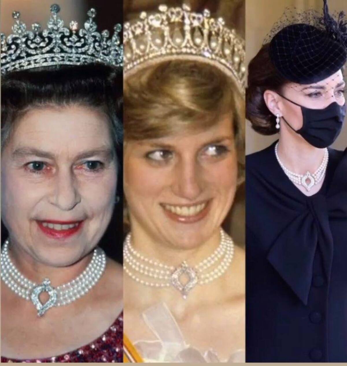 El collar de gargantilla de perlas japonesas fue usado por Kate para la cena del 70 aniversario de bodas de la reina y el príncipe Felipe en el castillo de Windsor en 2017, y por su difunta suegra, la princesa Diana, en 1982.