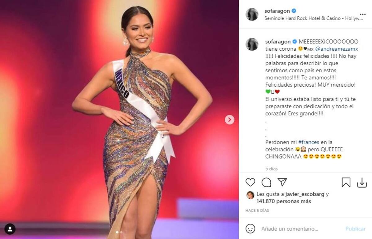 Una vez que Andrea fue nombrada Miss Universo 2020 y recibió la corona de su antecesora sudafricana, Zozibini Tunzi, Sofía le hizo saber lo orgullosa que se sentía de ella por el importante logro que había alcanzado.