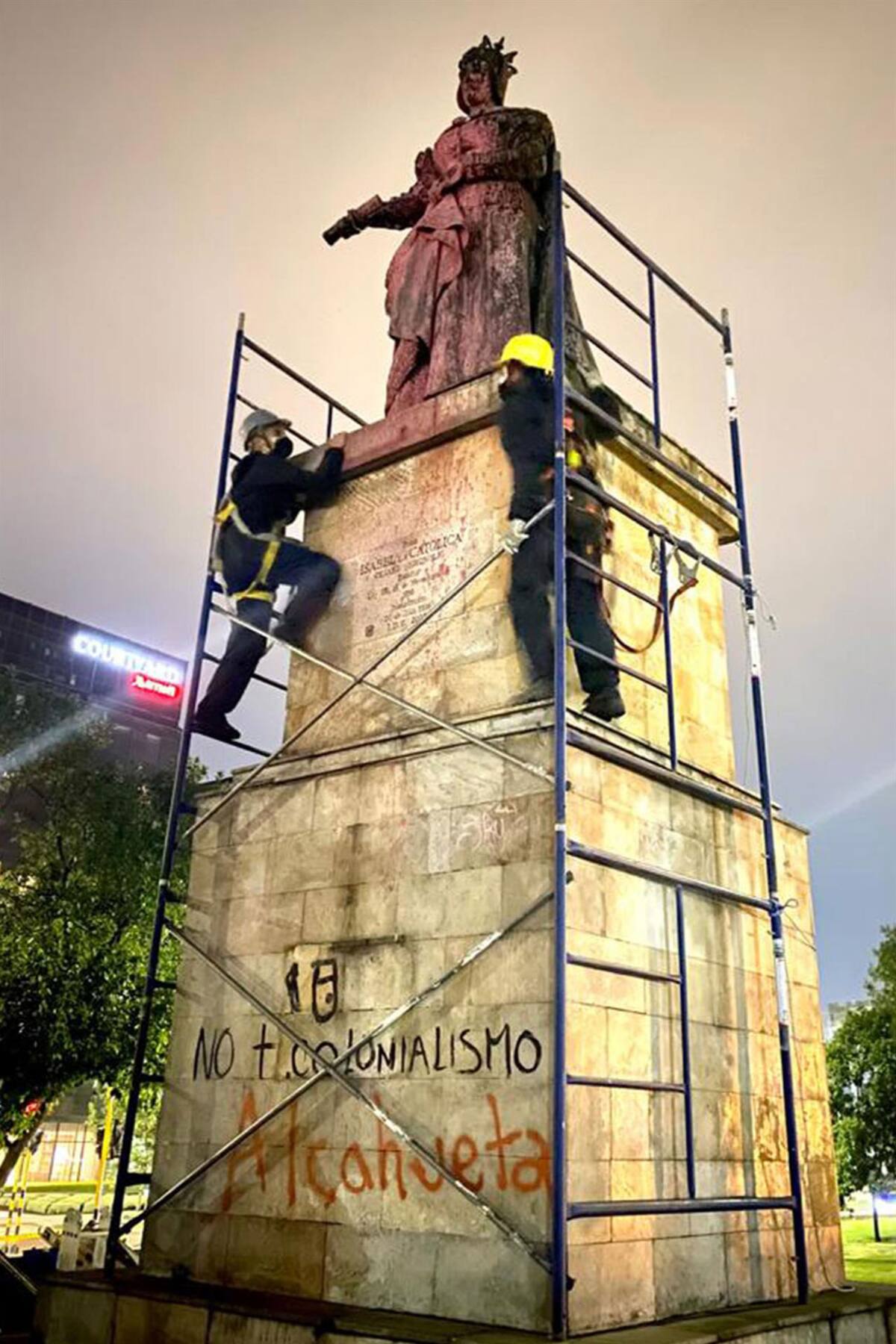 Bogotá, Colombia.- El Ministerio de Cultura de Colombia retiró de sus pedestales las estatuas de bronce del "Monumento a Isabel la Católica y Cristóbal Colón", ubicado en cercanías del aeropuerto internacional El Dorado de Bogotá, luego de que esta semana indígenas misak intentaran derribarlas.
