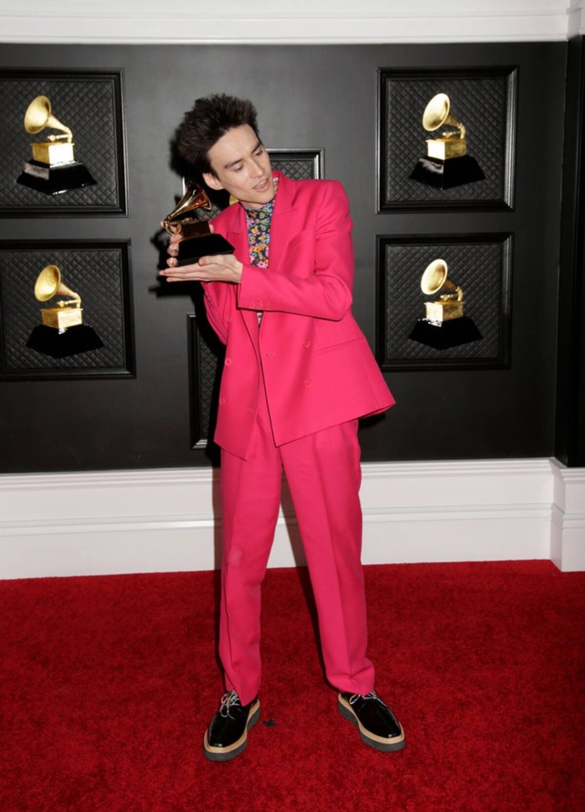Pero antes de todos estos hombres, el aclamado músico Jacob Collier también se dejó ir con un traje rosa pero en una tonalidad bastante diferente a las que hemos visto, un poco más cercana al chicle y acercándose al rojo. También de estilo cruzado le da una figura interesante y el joven le dio el toque extra con una camisa floreada.