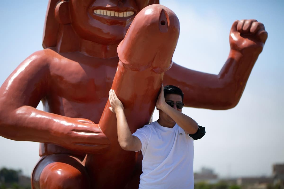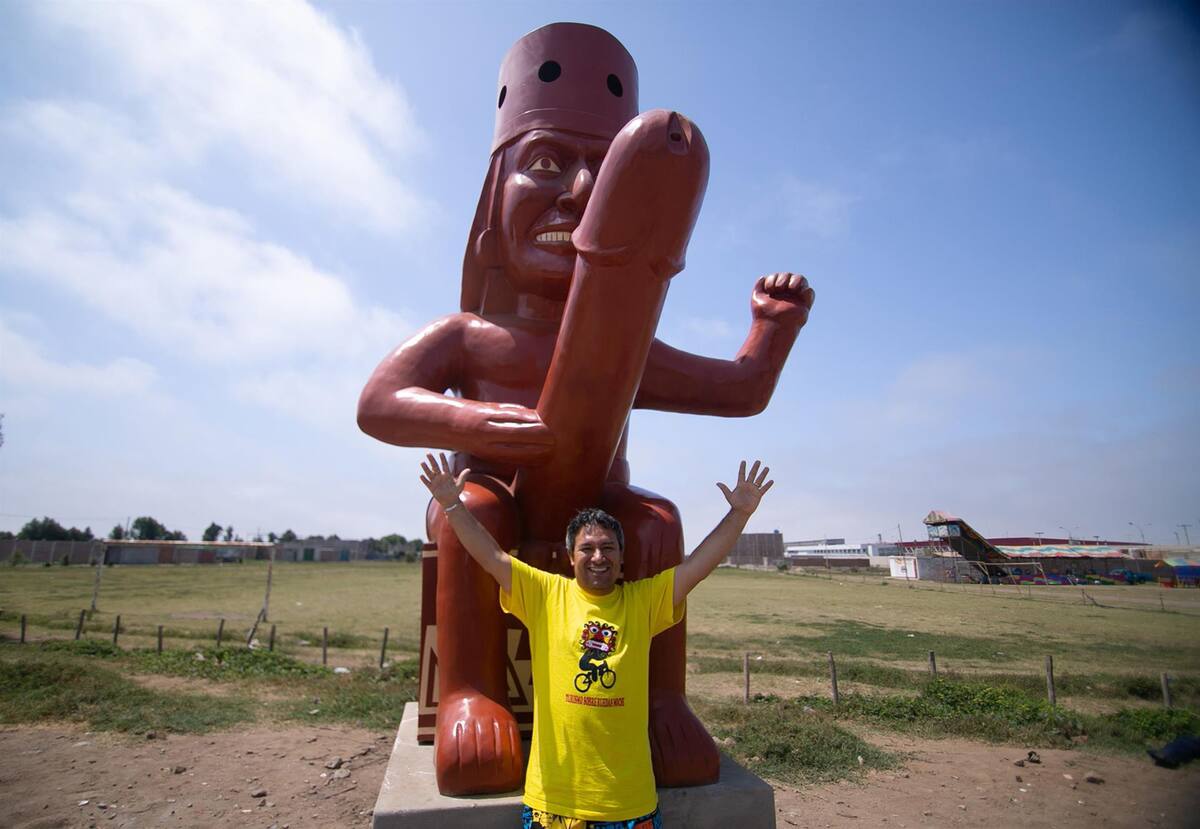 La estatua es la nueva atracción turística de un pueblo peruano, que ha hecho este particular homenaje a sus antepasados, la civilización prehispánica moche y sus vasijas de cerámica eróticas.