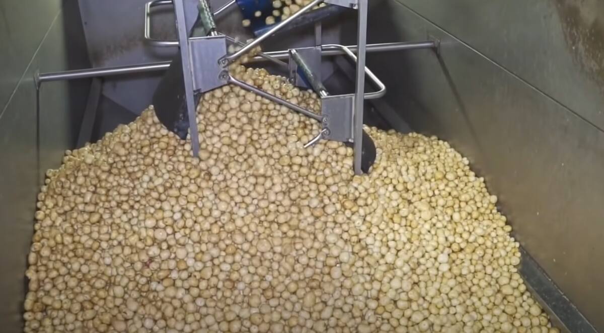 Una vez pesada la cantidad necesaria, las papas se trasladan a la máquina peladora. Las paredes del tambor están cubiertas con una superficie abrasiva en la que se mueven las papas.