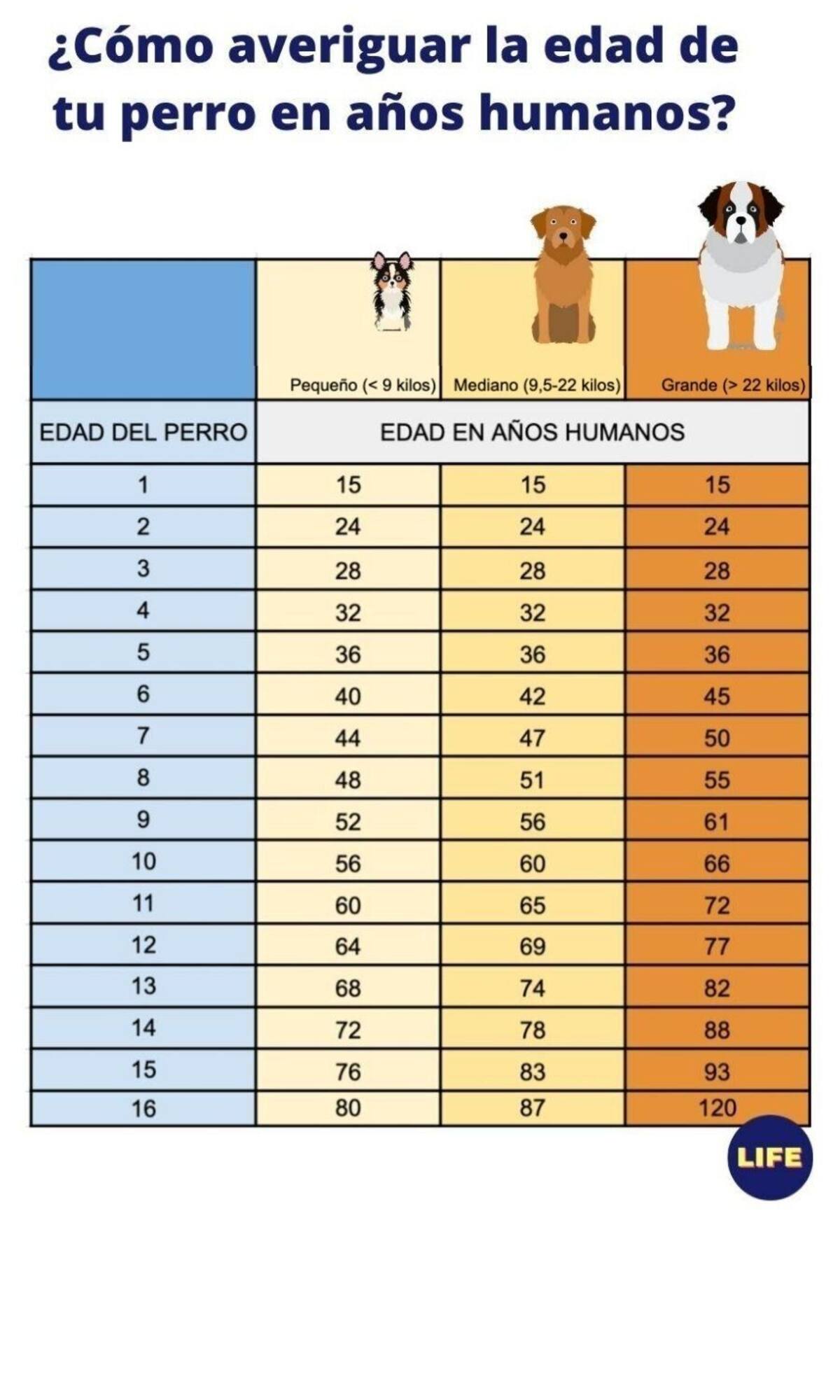 Todas las personas que tienen perros en su familia ya habrán notado que estos pequeños peludos envejecen de manera más rápida que los seres humanos. Por si tenías la duda de cuántos años exactos tiene tu perro, la tabla anterior puede ayudarte para tener una idea de su edad, dejando atrás el viejo mito de que por cada año son 7 años humanos.