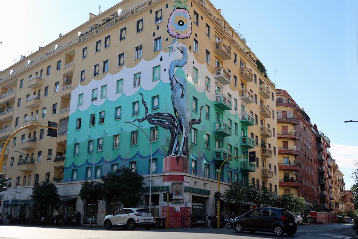 El más famoso es el realizado por el artista italiano Iena Cruz, considerado el mural verde más grande de Europa, ya que fue realizado con Airlite, una pintura ecológica especial que captura las sustancias contaminantes y las destruye gracias a una reacción similar a la fotosíntesis de la clorofila de las plantas.