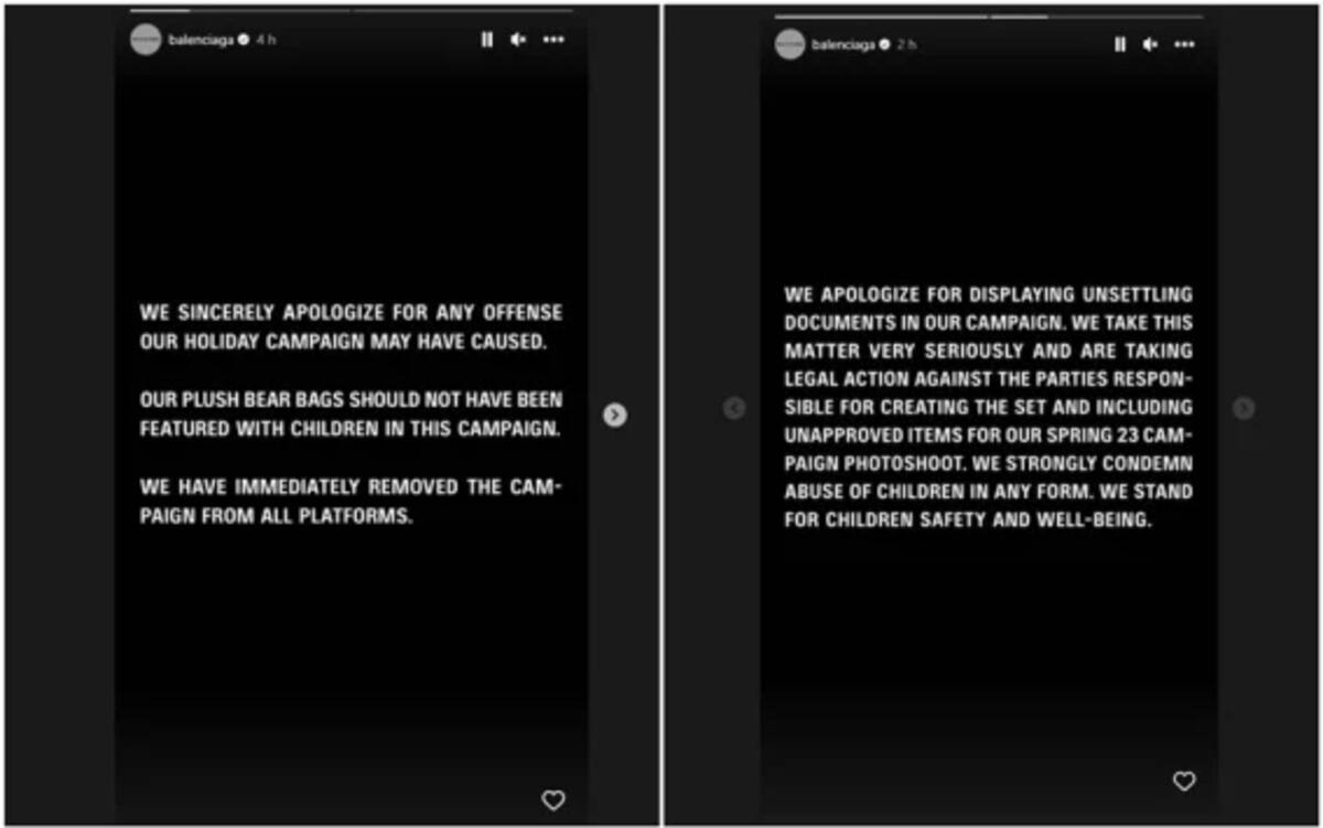 A través de sus historias de Instagram, Balenciaga se disculpó y aseguró que están tomando acciones legales contra los autores de la campaña, incluyendo a quienes tomaron las fotos. Además, reiteraron que condenan enérgicamente el abuso de menores en cualquier forma, por el contrario, defienden su seguridad y bienestar.