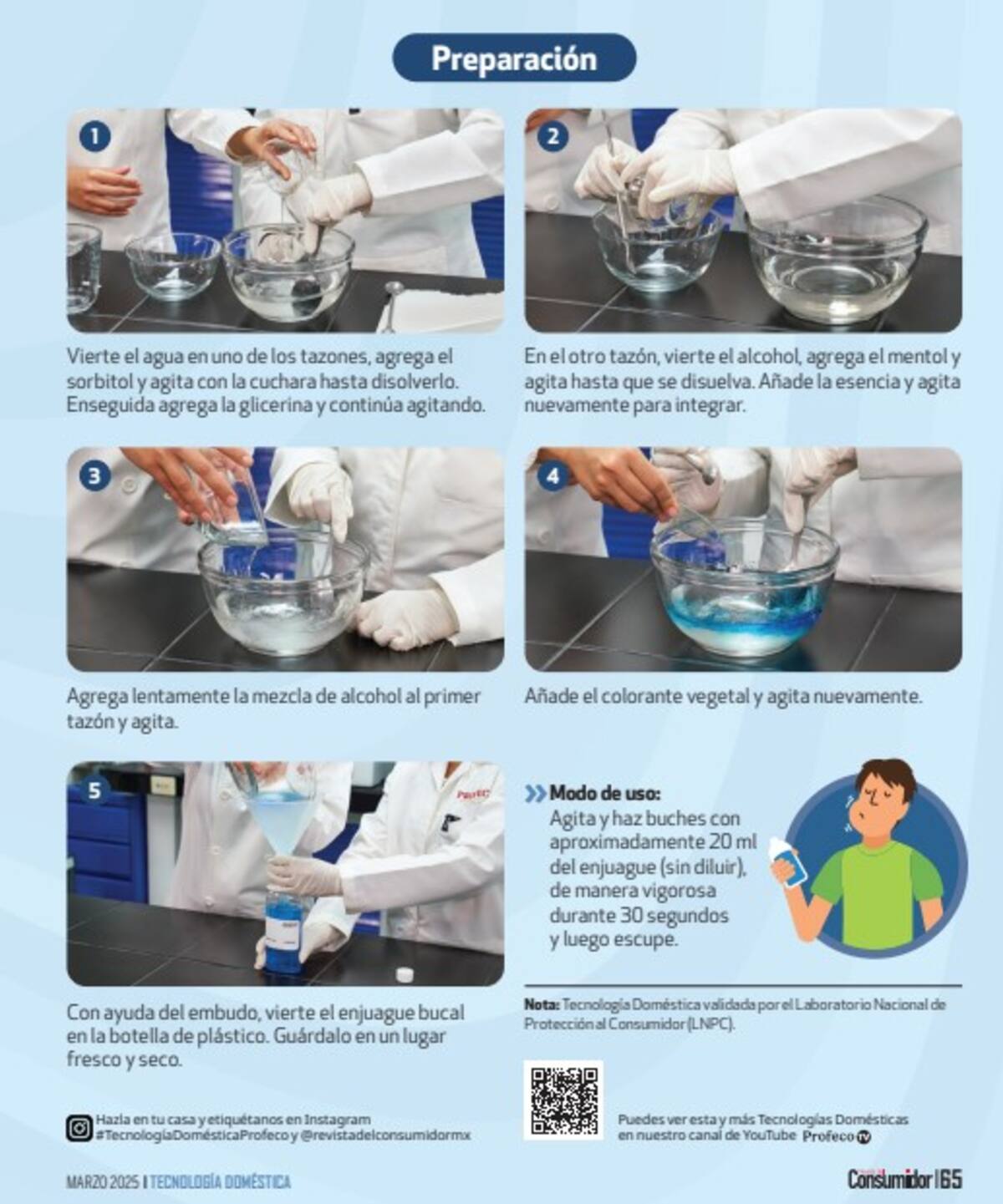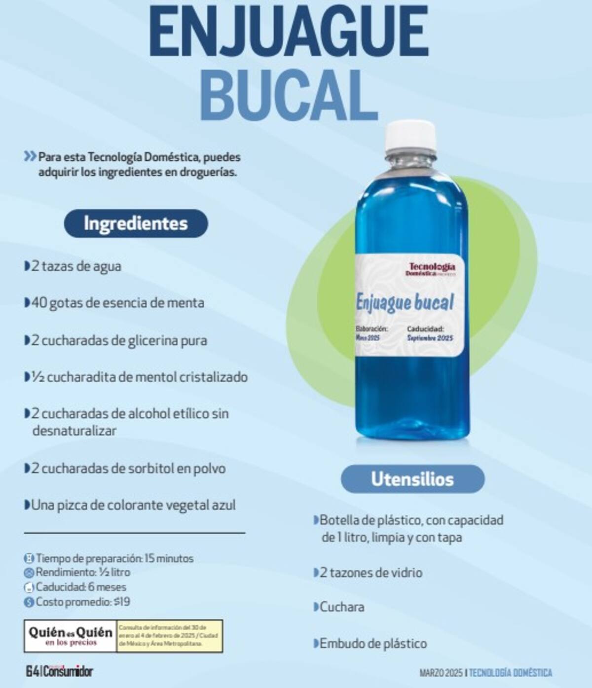 Si quieres mantener tu boca fresca y libre de bacterias sin gastar de más, hacer tu propio enjuague bucal casero es una excelente opción. Además de ser económico, es fácil de preparar, dura hasta seis meses y su efectividad ha sido validada por el Laboratorio Nacional de Protección al Consumidor.