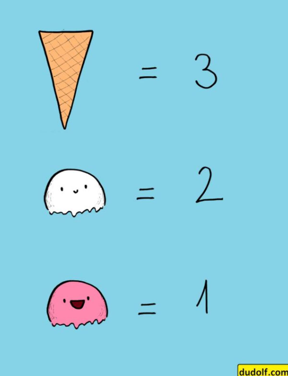 El valor del cono es 3; la bocha de helado de vainilla 2; y la de fresa 1.