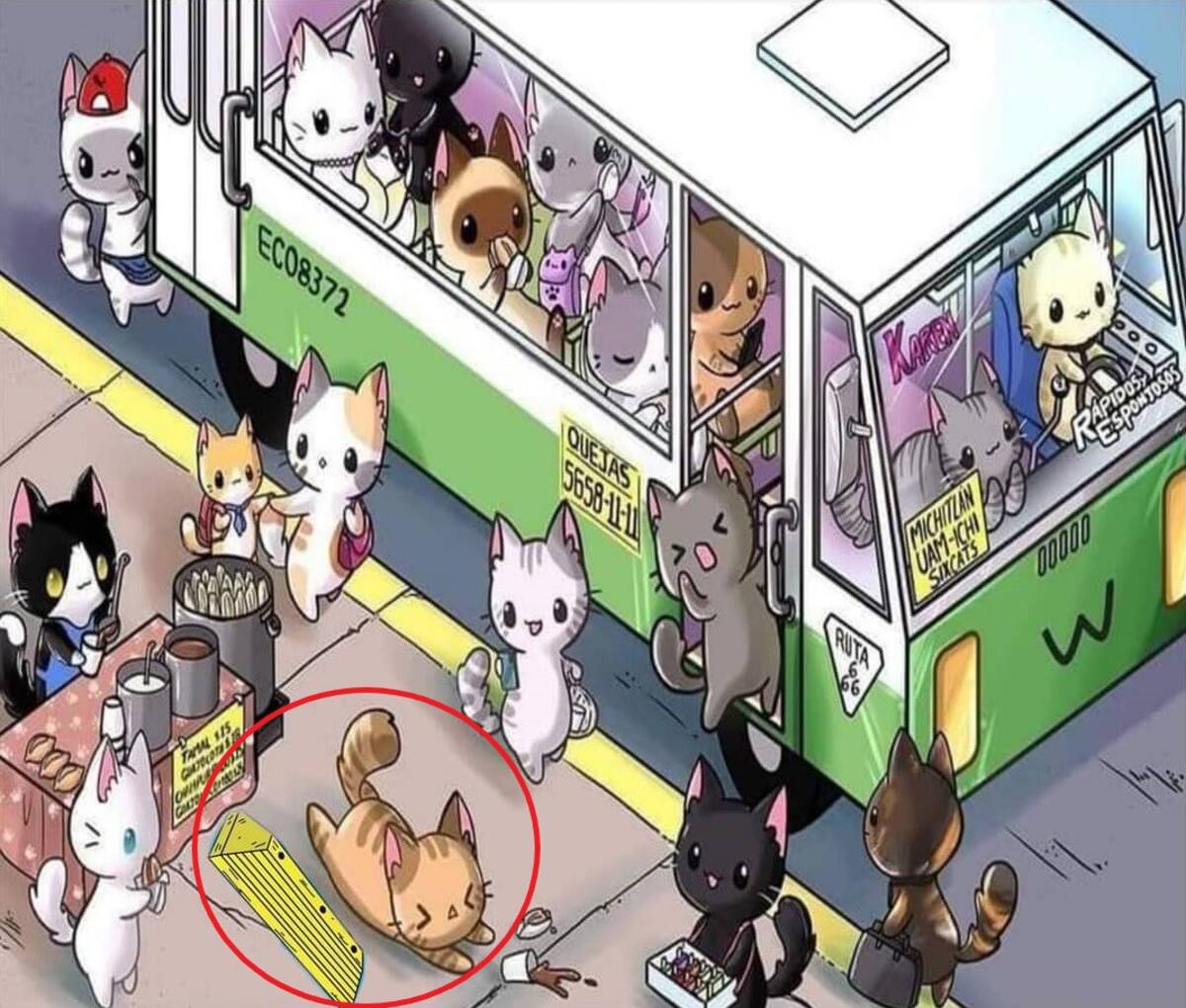 En la imagen aparecen una gran cantidad de gatitos en un microbús, desde el que va dormido hasta el que mira su celular. Michitlán, UAM-ichi y Sixcats son los destinos a los que se dirigen los michi pasajeros. En el parabrisas del vehículo se lee 'Rápidos y esponjosos' y 'Karen', la cual hace referencia a todos los dueños que tienen un minino como mascota. Además, hay un puesto de tamales y atole, así como un felino asaltante detrás del micro.