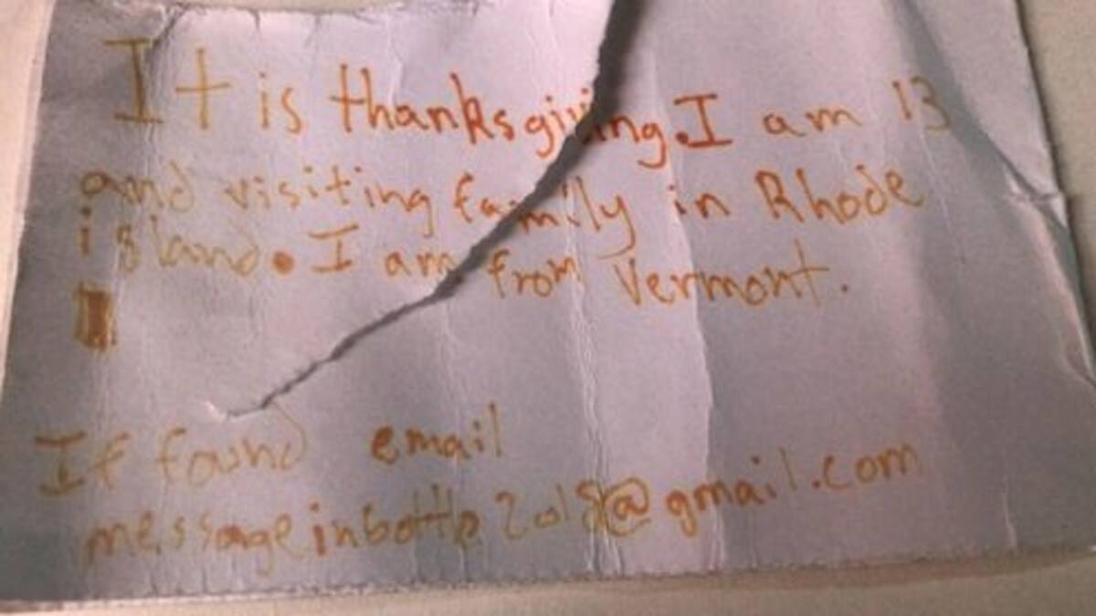 "Es Acción de Gracias. Tengo 13 años y estoy visitando a mi familia en Rhode Island. Yo soy de Vermont. Si se encuentra, envíe un mensaje de correo electrónico a messageinbottle2018@gmail.com", dice el mensaje.