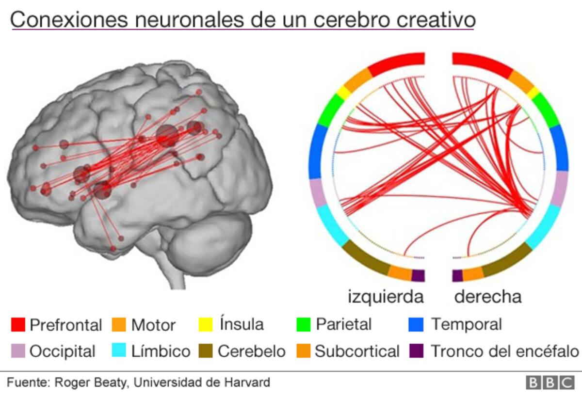 "La primera sería la red neuronal por defecto, utilizada para crear ideas. La segunda seria la de control ejecutivo, encargada de evaluar las ideas generadas, si son buenas o no y si cumplen los requisitos de lo que uno intenta resolver. La tercera red se encarga de alternar entre las dos primeras", explica Beaty a BBC Mundo.