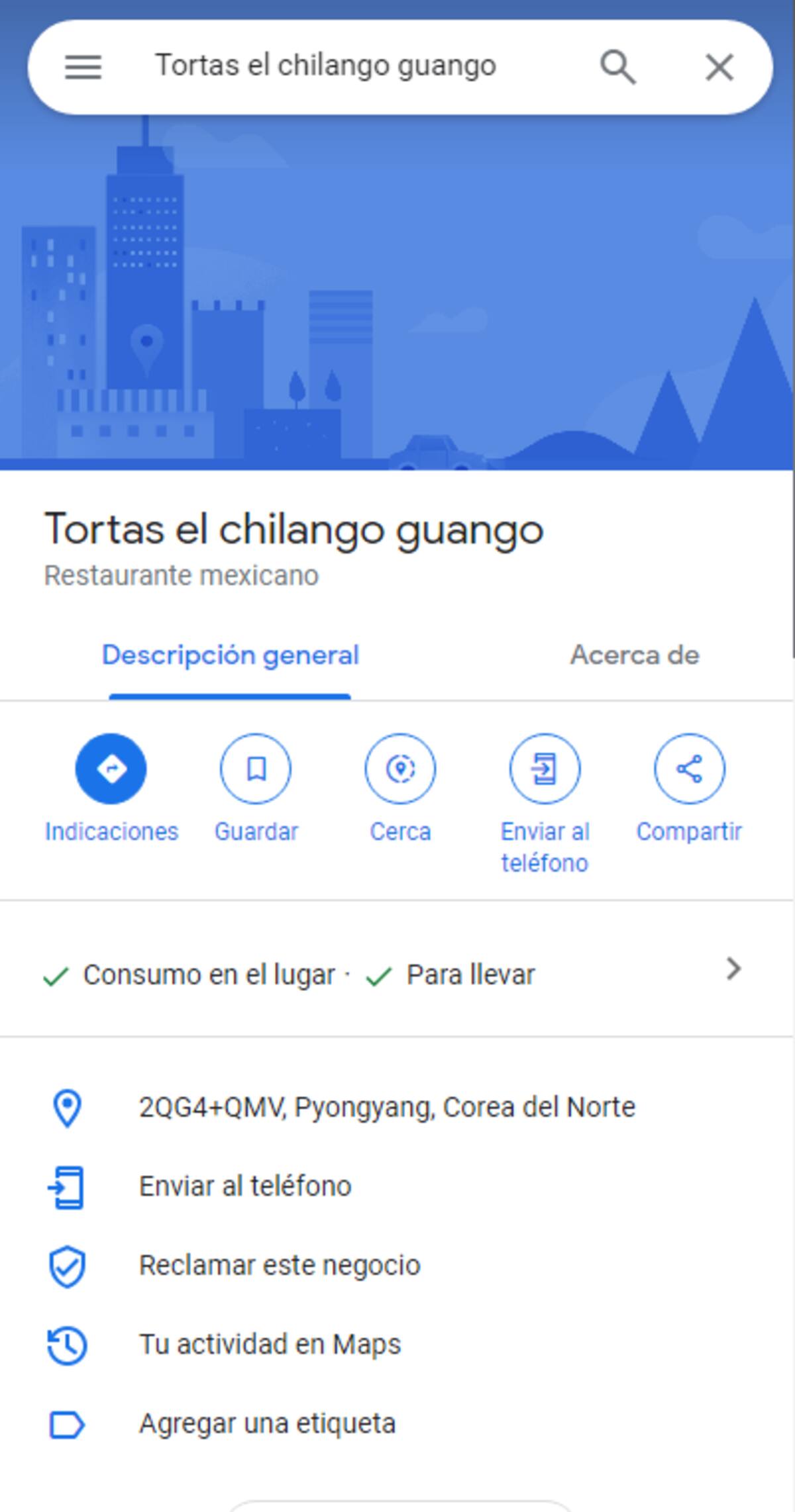 Las dudas aumentan al revisar la información disponible en Google Maps sobre este local. No hay menús, horarios de servicio ni fotografías disponibles, lo que sugiere que podría tratarse más de una ocurrencia humorística que de un establecimiento gastronómico legítimo.