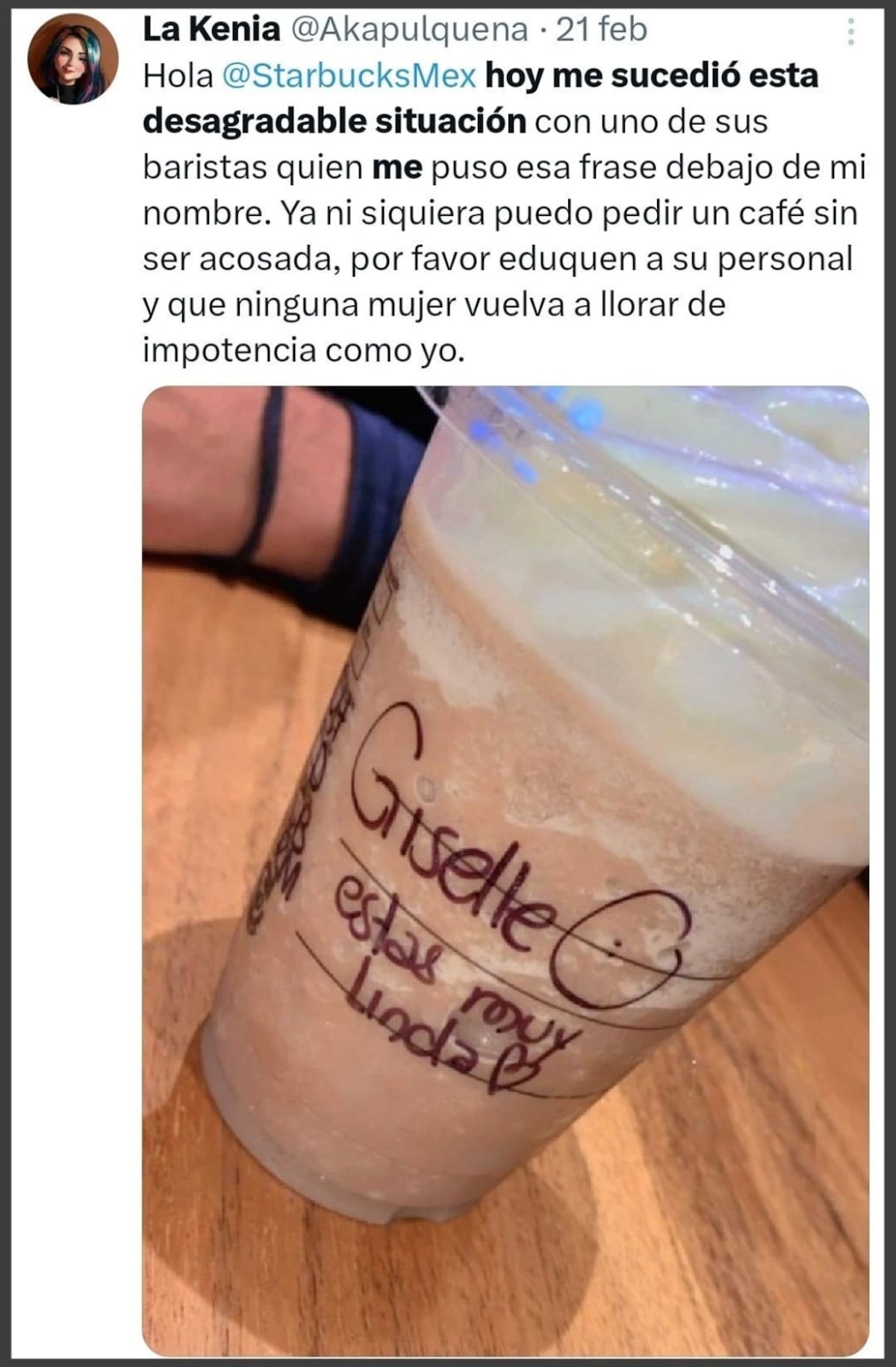 “Hola @StarbucksMex, hoy me sucedió esta desagradable situación con uno de sus baristas quien me puso esa frase debajo de mi nombre. Ya ni siquiera puedo pedir un café sin ser acosada, por favor eduquen a su personal y que ninguna mujer vuelva a llorar de impotencia como yo”, escribió en su publicación.