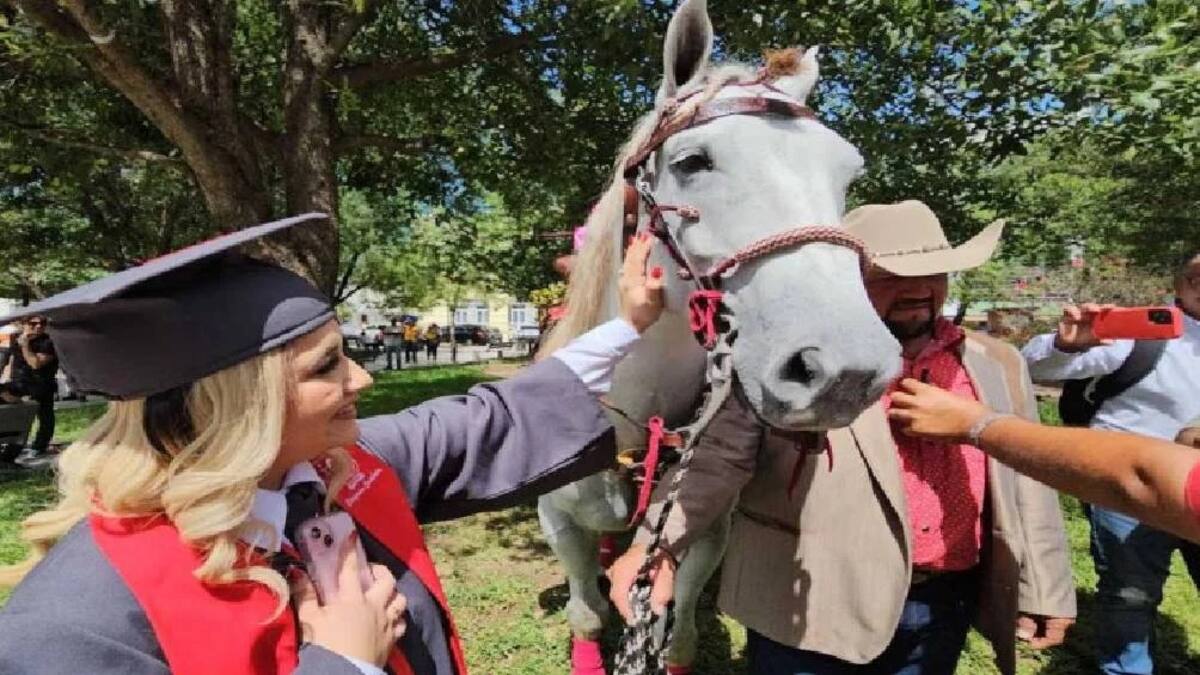 Después de graduarse como maestra de preescolar en Ciudad Victoria, Tamaulipas, Estefanía Ávila Martínez recibió un regalo inolvidable de su padre: un caballo de cinco años de edad. Emocionada hasta las lágrimas por este gesto tan significativo, la recién graduada en educación preescolar experimentó un momento emotivo este lunes en el Centro Cultural “Amalia G. de Castillo Ledón”, ubicado frente al palacio de gobierno.