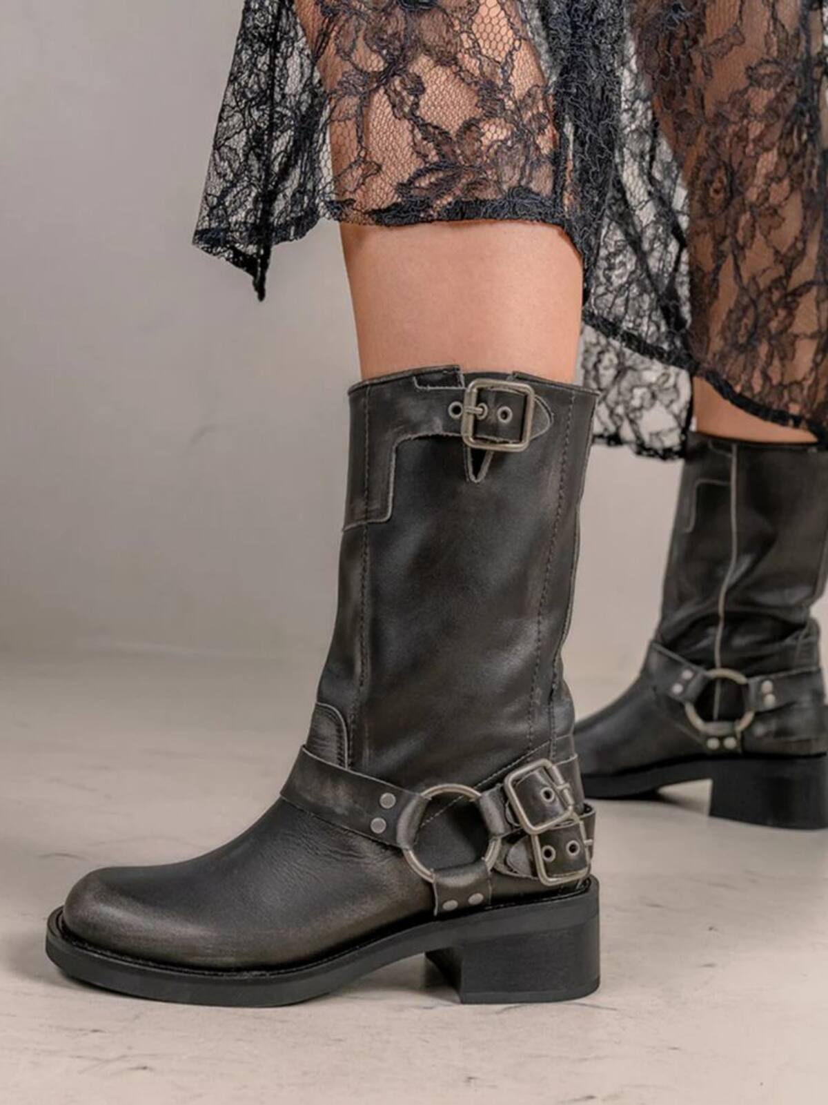 El estilo rebelde de las botas biker sigue en tendencia, aportando un toque rudo y desenfadado a cualquier conjunto. Con hebillas, cadenas y cuero como materiales predominantes, estas botas son perfectas para un look más atrevido.