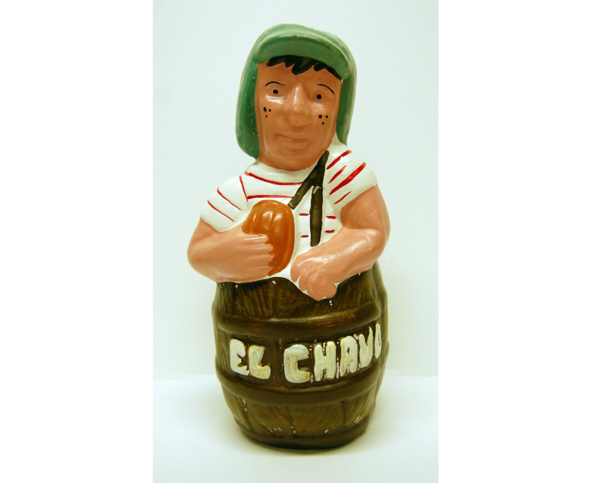 La figura muestra a El Chavo, el querido personaje creado por Roberto Gómez Bolaños en la década de los setenta, sentado en su clásico barril y sosteniendo una torta de jamón.