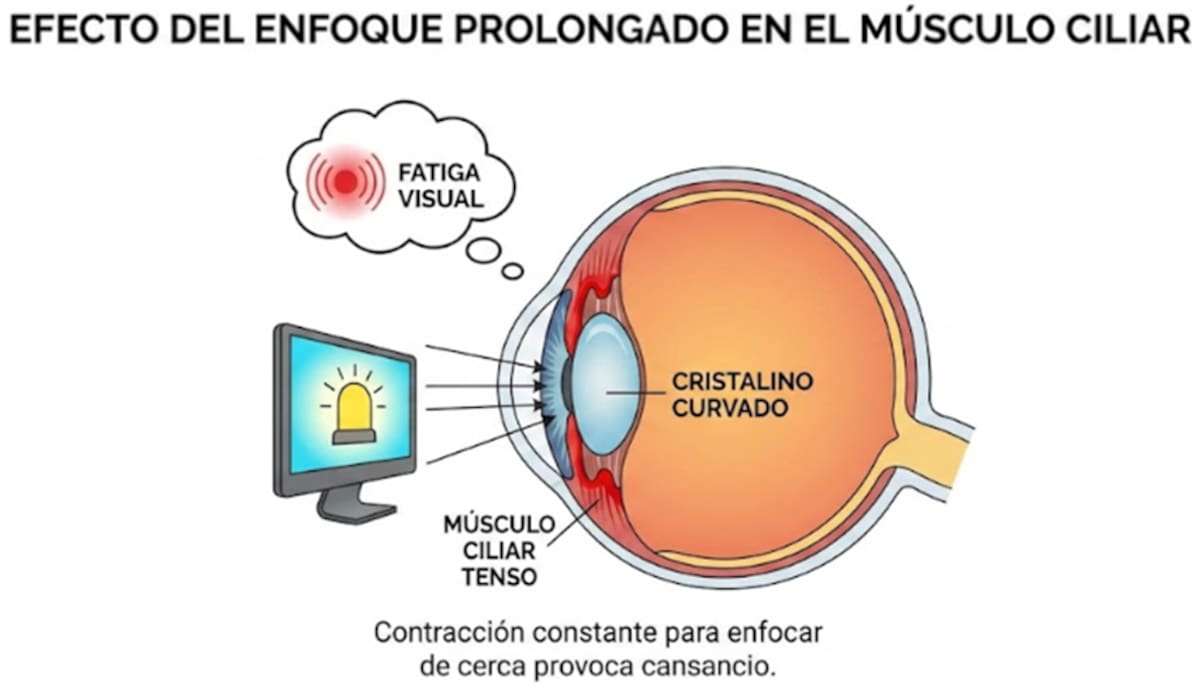 Cuando pasamos horas mirando un monitor, este músculo permanece en un estado de contracción constante, lo que eventualmente provoca calambres y fatiga. De la misma forma que nos dolería el brazo si sostuviéramos una pesa durante horas sin descanso.