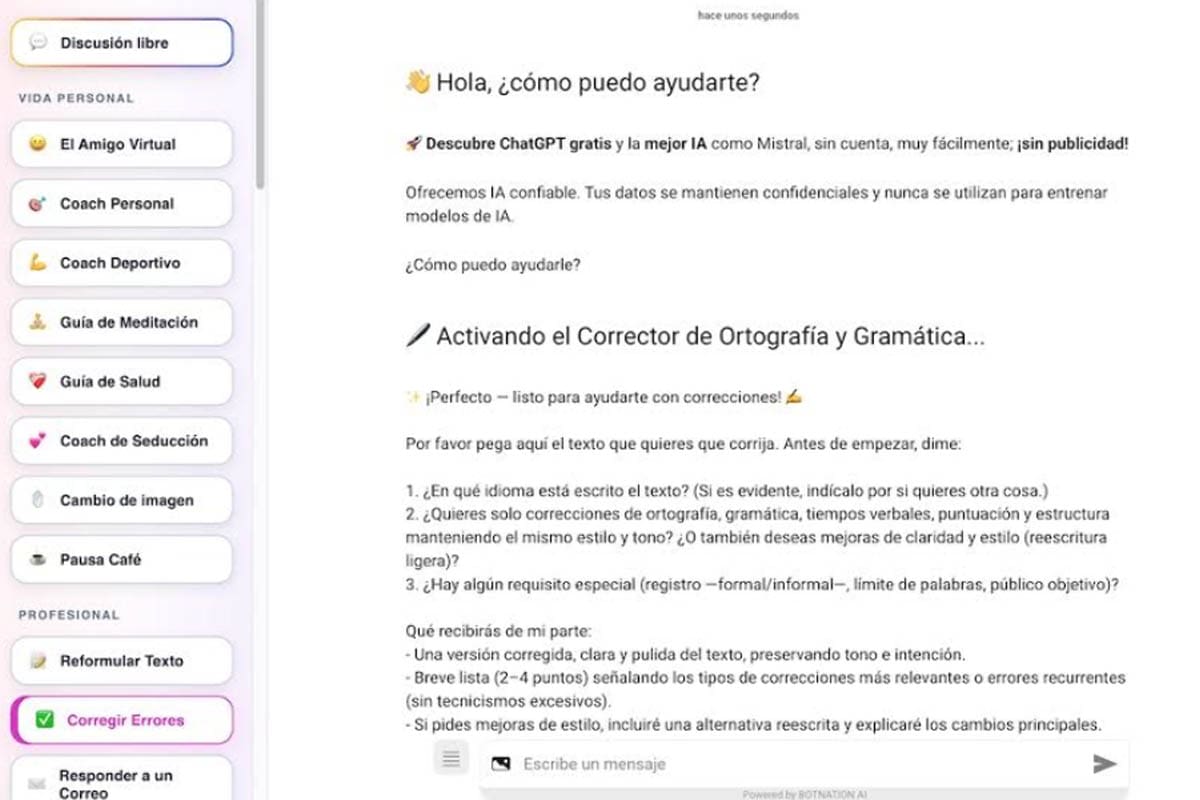 Porque una cosa es tener acceso a una IA, y otra muy distinta es poder usarla bien desde el primer minuto. Ahí está la diferencia de verdad. Nation AI ofrece prueba gratuita sin crear cuenta, una interfaz muy guiada y botones listos para tareas como corregir errores, reformular texto, responder un correo o activar un amigo virtual. En su web también destaca que busca ser fácil de usar para todo el mundo, con botones de guía y funciones como análisis de PDF e imágenes.