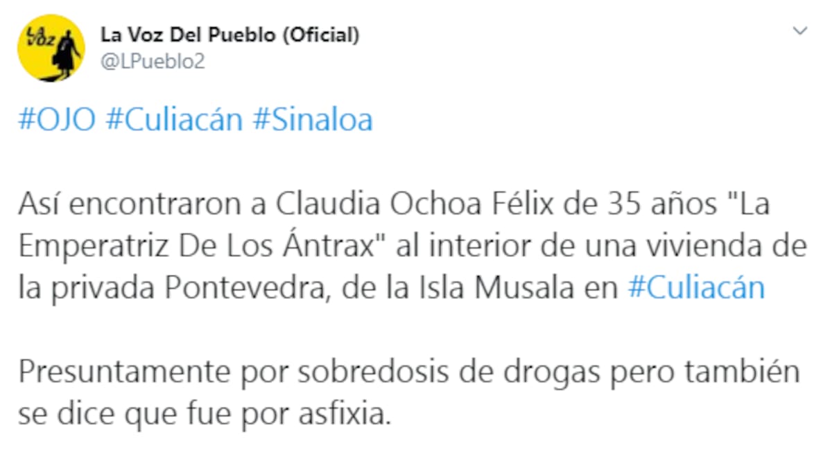 “Así encontraron a Claudia Ochoa Félix de 35 años "La Emperatriz De Los Ántrax" al interior de una vivienda de la privada Pontevedra, de la Isla Musala en #Culiacán”.