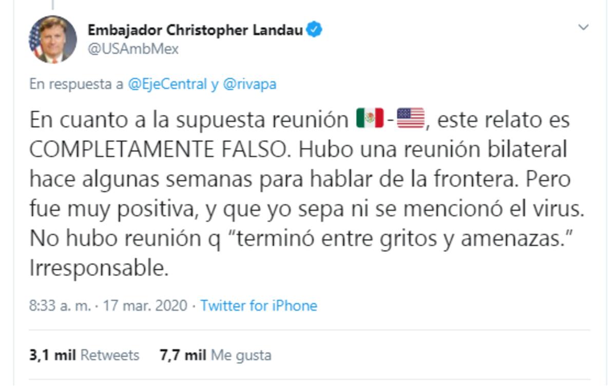 En el intercambio que se originó sobre la supuesta reunión fronteriza, Riva Palacio reiteró el tema de la pandemia por el COVID-19 y el funcionario norteamericano reviró: