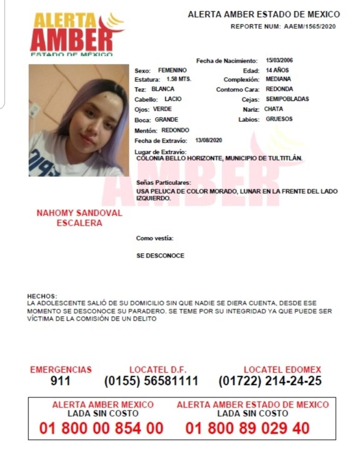 TIJUANA, Baja California.- La Fiscalía General del Estado de Baja California, en coordinación con autoridades de Alerta Amber en el Estado de México, difunde la pesquisa de la menor Nahomy Sandoval Escalera de 14 años de edad, la cual se extravió el pasado jueves 13 de agosto de 2020 en la colonia Bello Horizonte del municipio de Tultitlán, Estado de México.