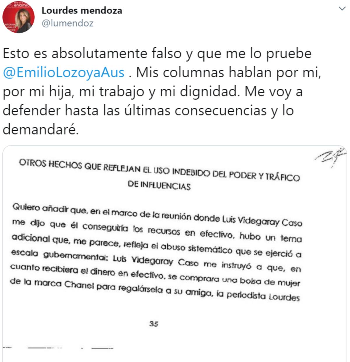 "Esto es absolutamente falso y que me lo pruebe @EmilioLozoyaAus . Mis columnas hablan por mi, por mi hija, mi trabajo y mi dignidad. Me voy a defender hasta las últimas consecuencias y lo demandaré (sic)".