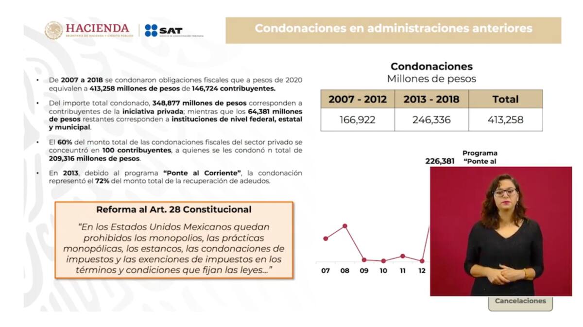 “El 60% del monto total de las condonaciones fiscales del sector privado se concentró en 100 contribuyentes, a quienes se condonó un total de 209 mil 316 millones de pesos”, según la presentación.