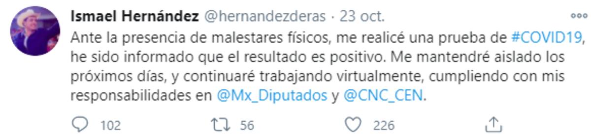 "Ante la presencia de malestares físicos, me realicé una prueba de #COVID19, he sido informado que el resultado es positivo. Me mantendré aislado los próximos días, y continuaré trabajando virtualmente, cumpliendo con mis responsabilidades en @Mx_Diputados y @CNC_CEN".
