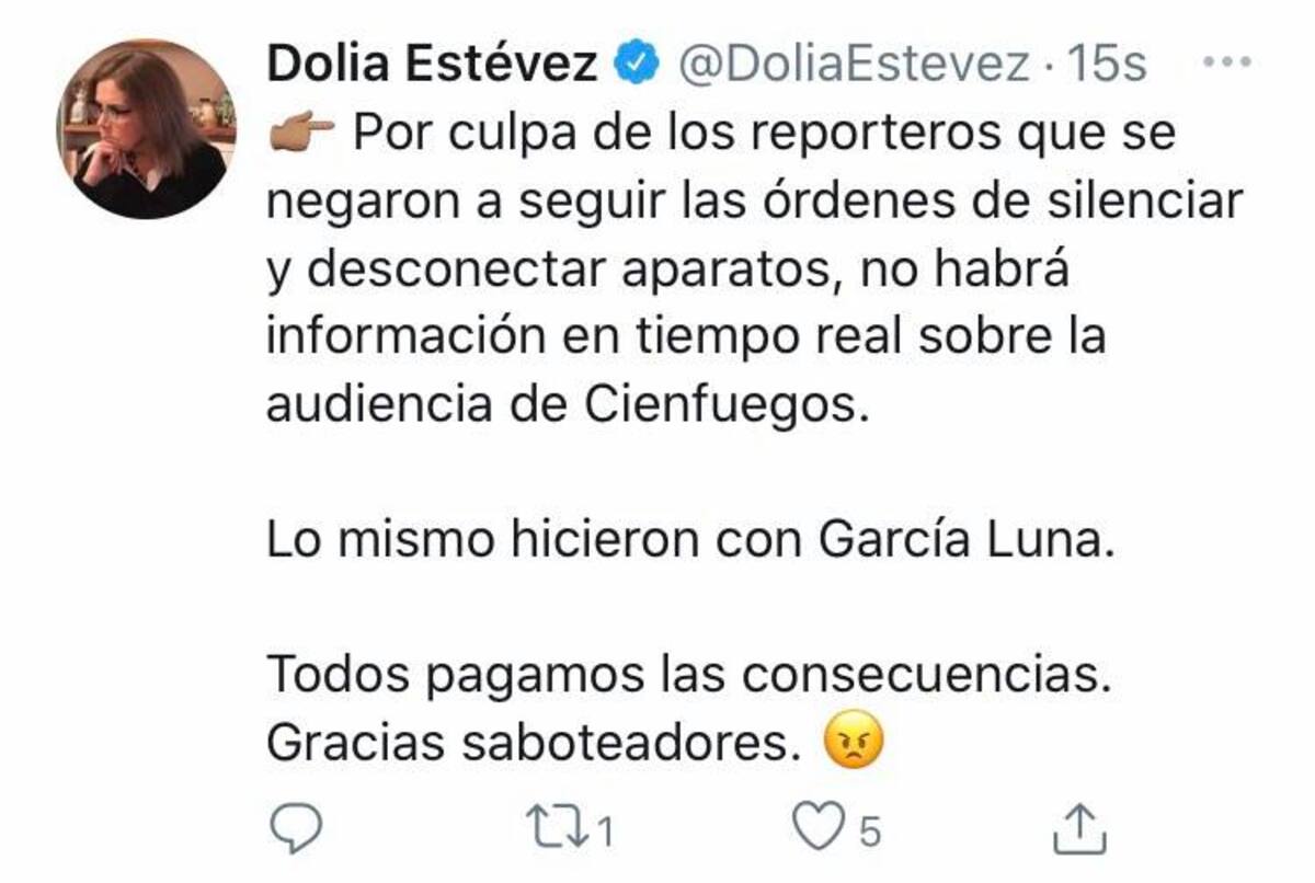 Después tuiteó que por culpa de reporteros que se negaron a seguir las órdenes de silenciar y desconectar sus aparatos, no habrá información en tiempo real sobre la audiciencia de Cienfuegos.