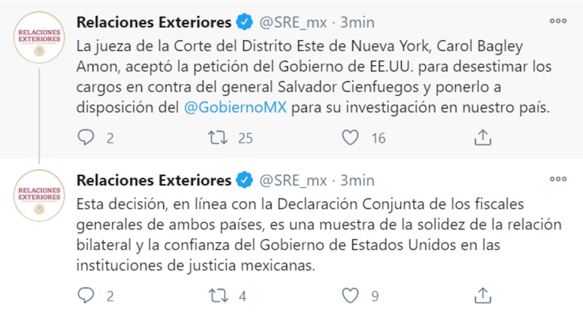 Ebrard comentó que México había manifestado su rechazo a la detención del general por no haber sido notificado de la investigación y recordó que el gobierno estudia revisar su relación con la agencia antidrogas estadounidense, la DEA. Por eso consideró positiva la decisión de Estados Unidos. “No la vemos como un camino a la impunidad sino cómo acto de respeto a México y a las fuerzas armadas de México”.