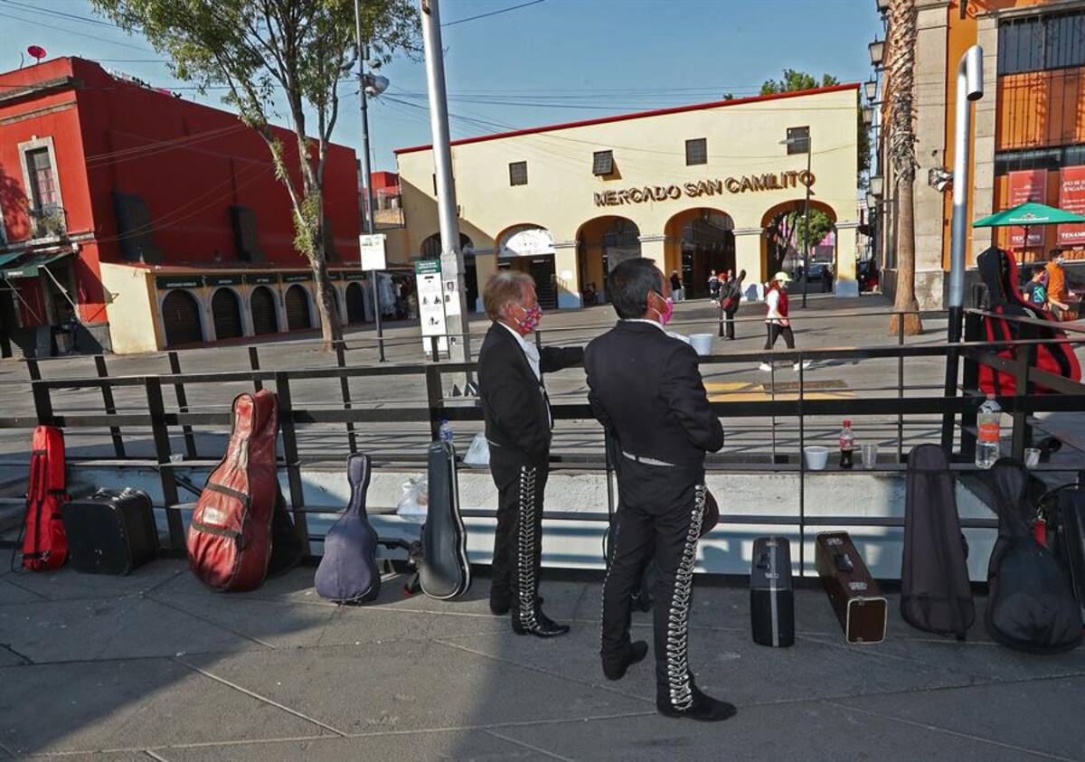 Músicos sobreviven en la Plaza Garibaldi en su día.