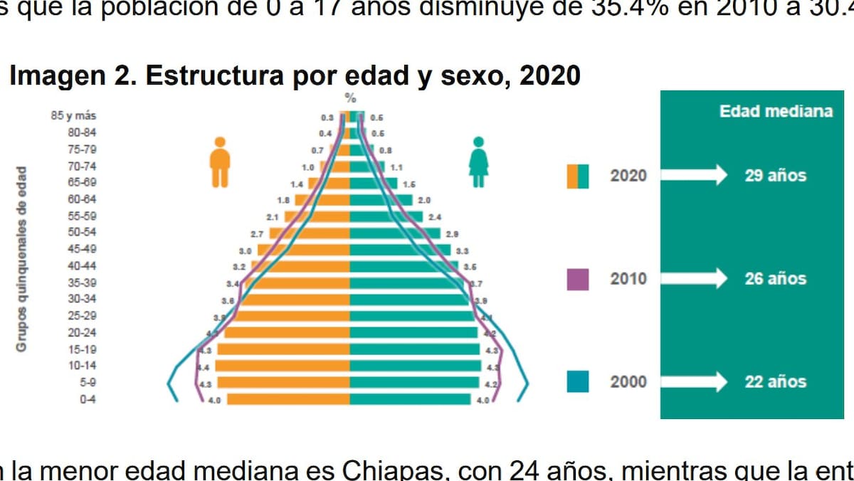 Chiapas es la entidad más joven (24 años de edad mediana) y Ciudad de México la entidad más envejecida (35 años de edad mediana).