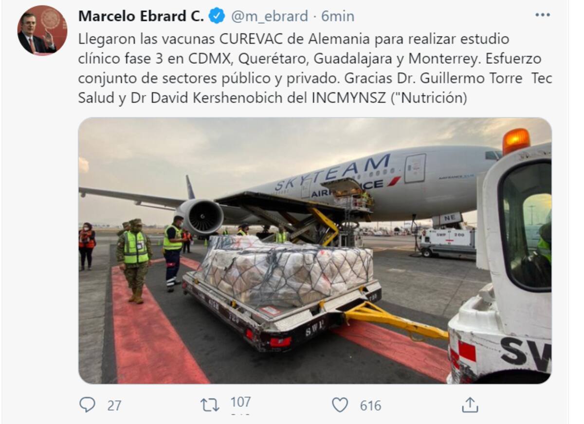 "Llegaron las vacunas CUREVAC de Alemania para realizar estudio clínico fase 3 en CDMX, Querétaro, Guadalajara y Monterrey. Esfuerzo conjunto de sectores público y privado. Gracias Dr. Guillermo Torre Tec Salud y Dr David Kershenobich del INCMYNSZ ("Nutrición)", dijo el secretario de Relaciones Exteriores en su cuenta de Twitter.