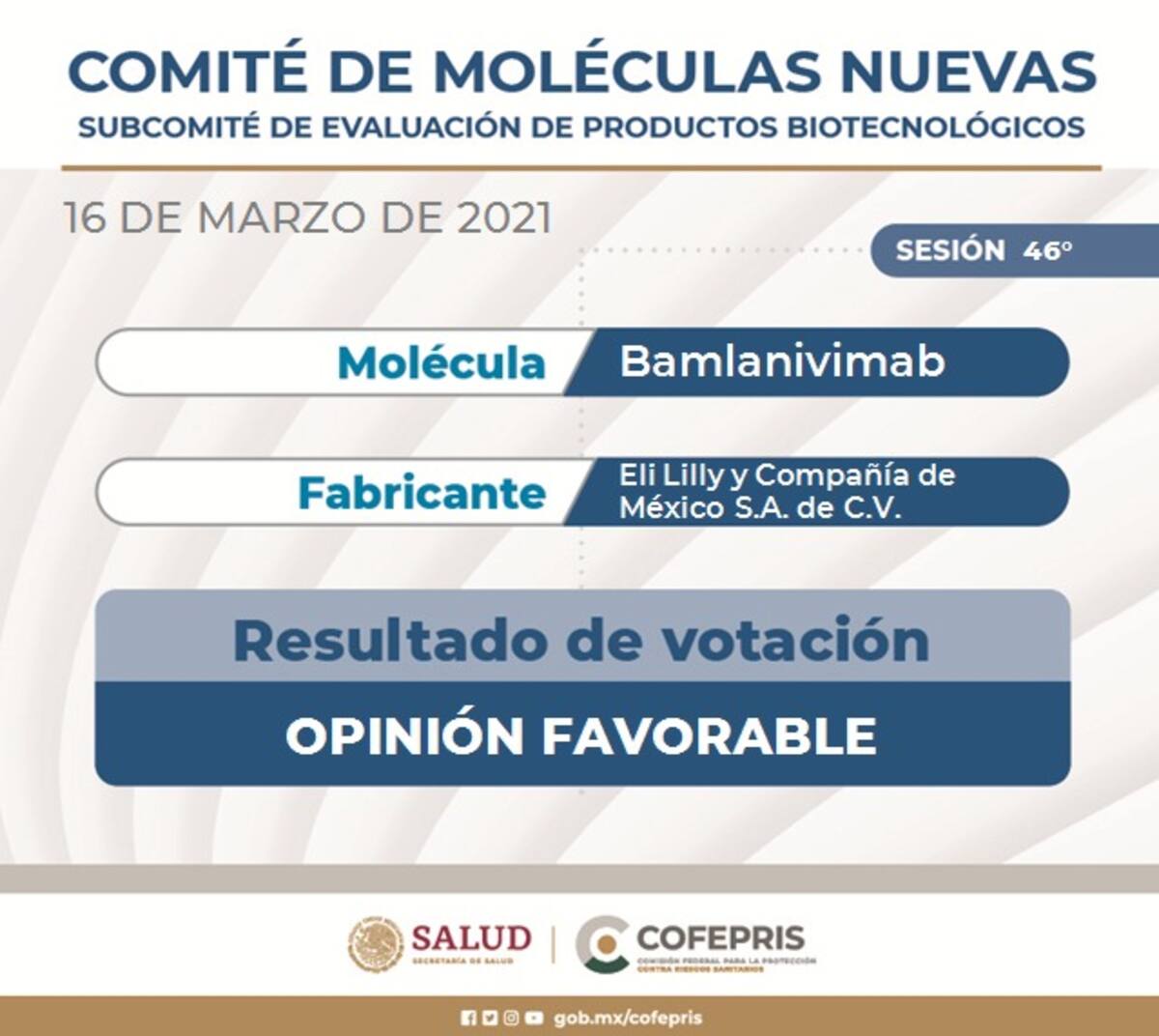 Cofepris informa que el medicamento Bamlanivimab recibió una opinión favorable por parte de la mayoría de las y los expertos, misma que deberá integrar a su expediente y presentar ante la Comisión de Autorización Sanitaria para su autorización de uso de emergencia.
