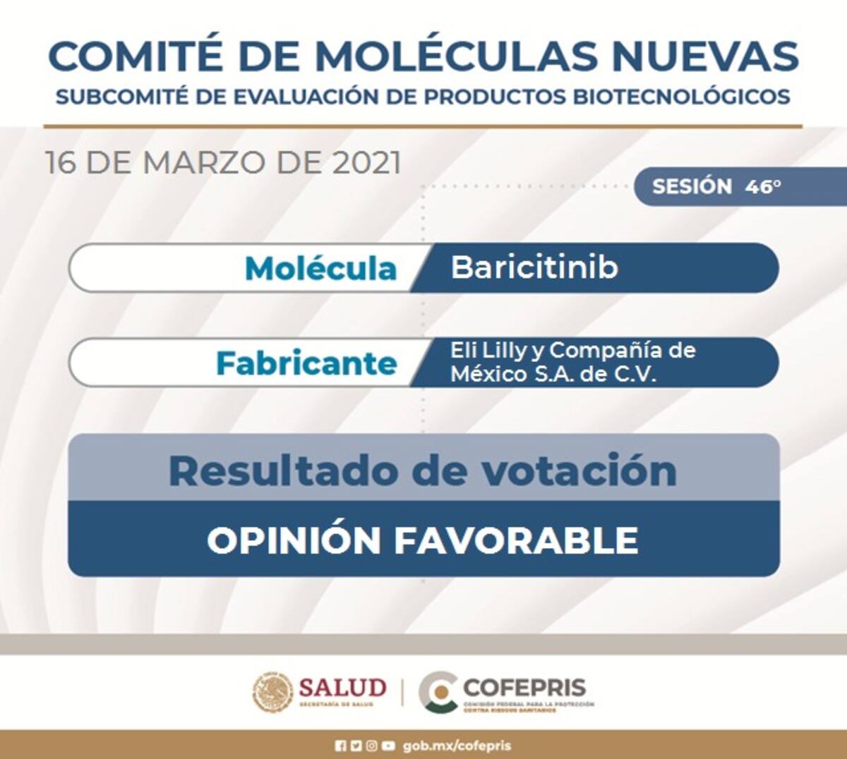 Cofepris informa que el medicamento Baricitinib recibió una opinión favorable por parte de la mayoría de las y los expertos, misma que deberá integrar a su expediente y presentar ante la Comisión de Autorización Sanitaria para su autorización de uso de emergencia.