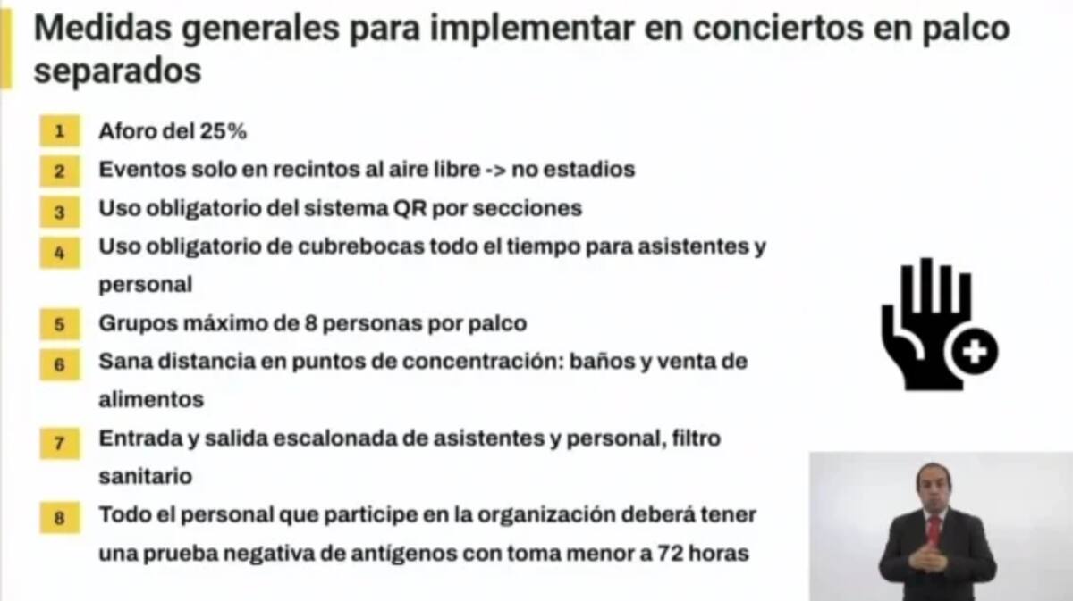 A partir del 15 de junio se llevará a cabo la reactivación gradual de conciertos en palcos separados en espacios abiertos, con aforo de 25%. Los eventos solo se permitirán en recintos al aire libre con uso obligatorio de código QR, cubrebocas, grupo máximo de 8 personas por palco, sana distancia y entrada y salida escalonada de asistentes y personal.