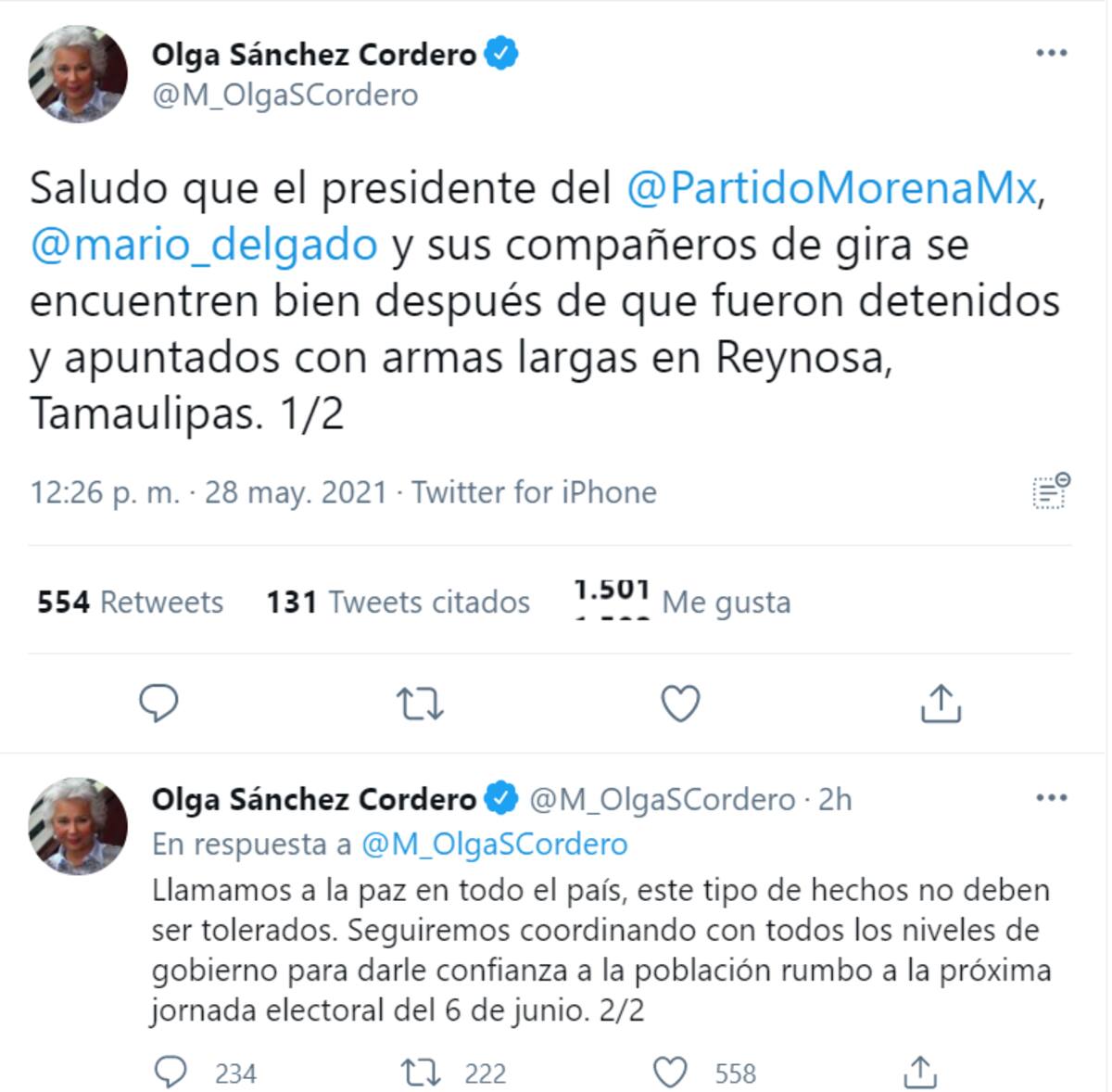 "Saludo que el presidente del @PartidoMorenaMx, @mario_delgado y sus compañeros de gira se encuentren bien después de que fueron detenidos y apuntados con armas largas en Reynosa, Tamaulipas. Llamamos a la paz en todo el país, este tipo de hechos no deben ser tolerados. Seguiremos coordinando con todos los niveles de gobierno para darle confianza a la población rumbo a la próxima jornada electoral del 6 de junio", comentó.
