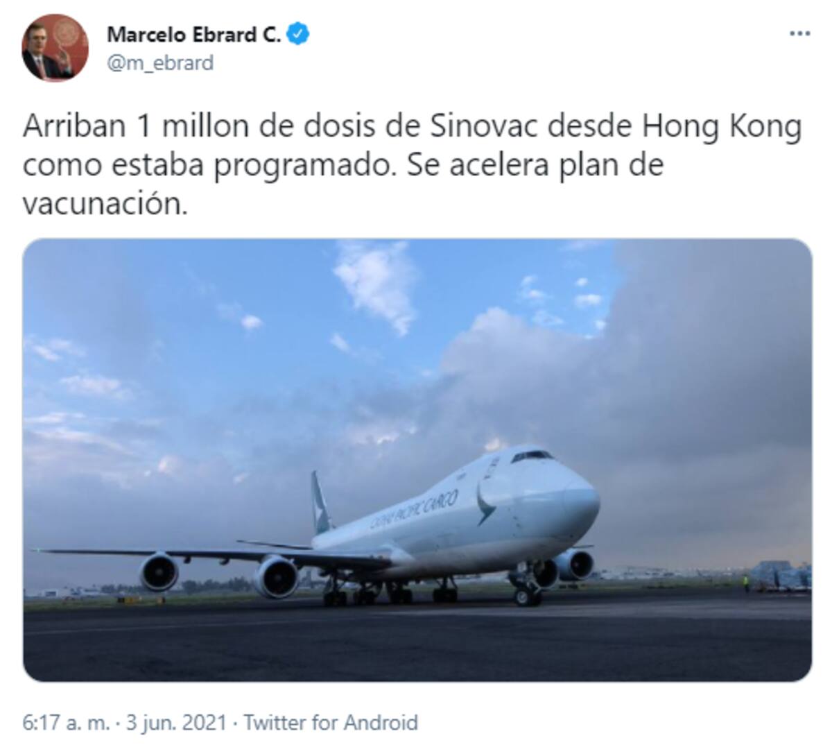 Llegan un millón de dosis de SinoVac contra el Covid-19 a México