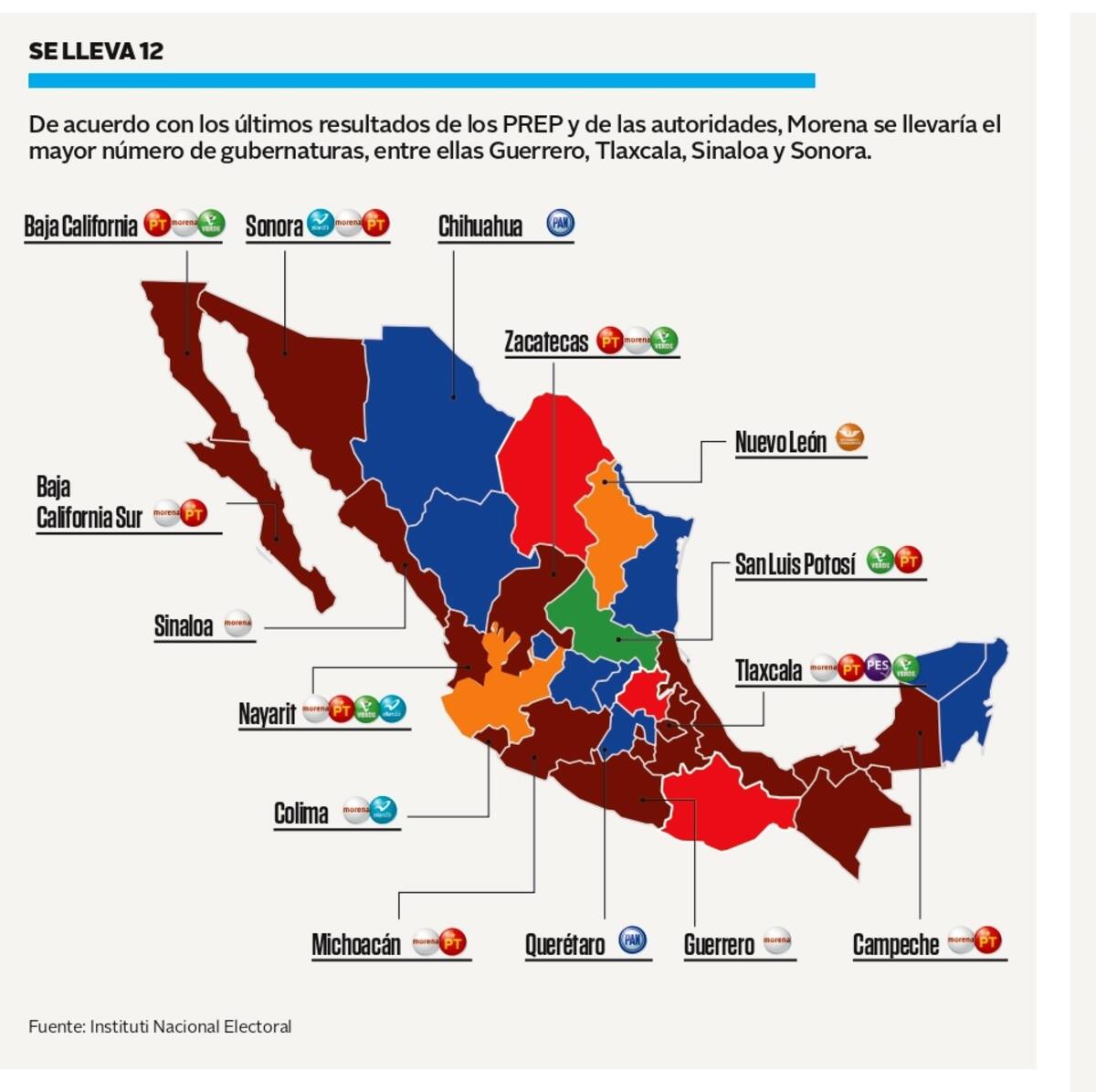 Morena, el partido que llevó a la presidencia a Andrés Manuel López Obrador, ganó en al menos once de las 15 gubernaturas que estaban en juego el pasado domingo, según los datos preliminares del Instituto Nacional Electoral (INE).