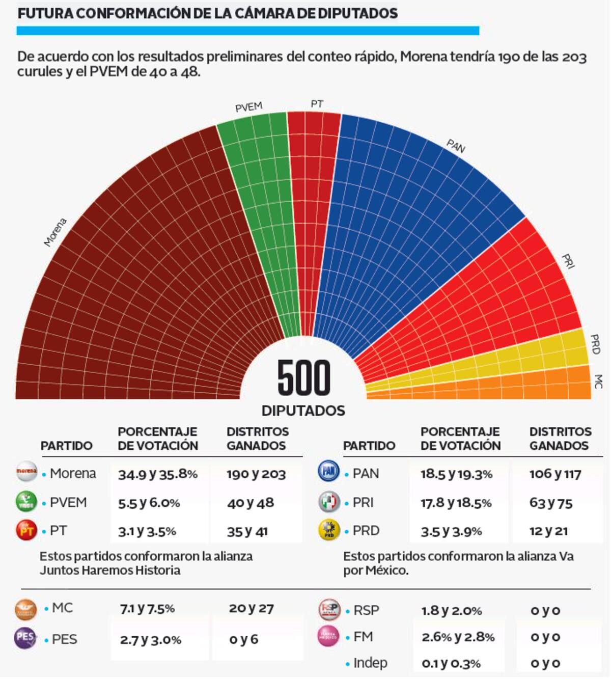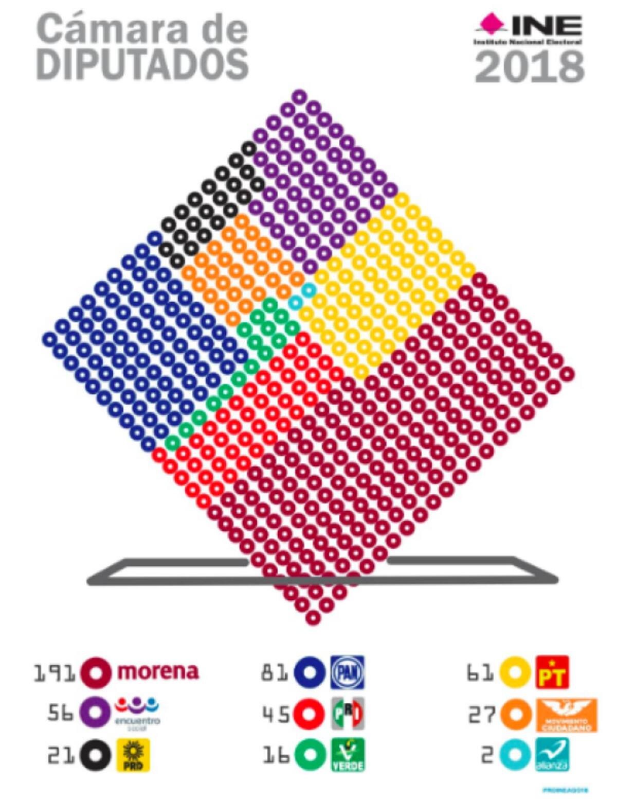 Con base en los resultados del 1 de julio del 2018, el Instituto Nacional Electoral (INE) determinó en agosto del año pasado que Morena tendría 191 diputados, de los cuales 106 serían de mayoría relativa, es decir, por voto directo, y 85 plurinominales.
