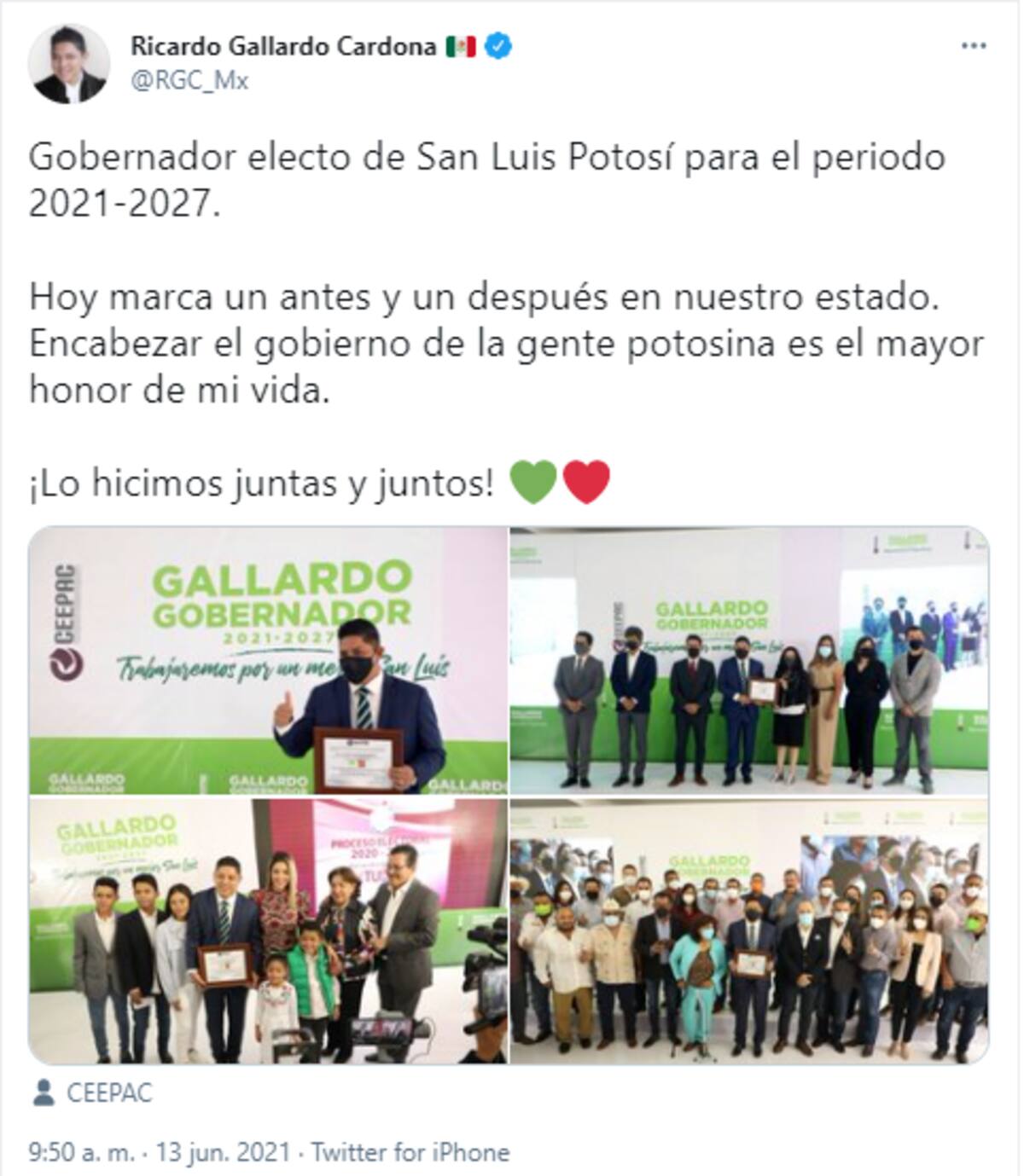 SAN LUIS POTOSÍ.- Ricardo Gallardo Cardona, de la coalición Juntos Haremos Historia, formada por el PVEM y el PT, recibió la constancia de mayoría por parte del Consejo Estatal Electoral y de Participación Ciudadana, que lo acredita como gobernador electo del estado de San Luis Potosí.
