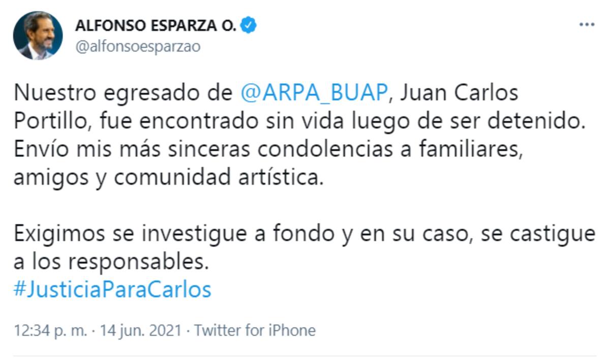 "Nuestro egresado de @ARPA_BUAP, Juan Carlos Portillo, fue encontrado sin vida luego de ser detenido. Envío mis más sinceras condolencias a familiares, amigos y comunidad artística. Exigimos se investigue a fondo y en su caso, se castigue a los responsables", demandó.