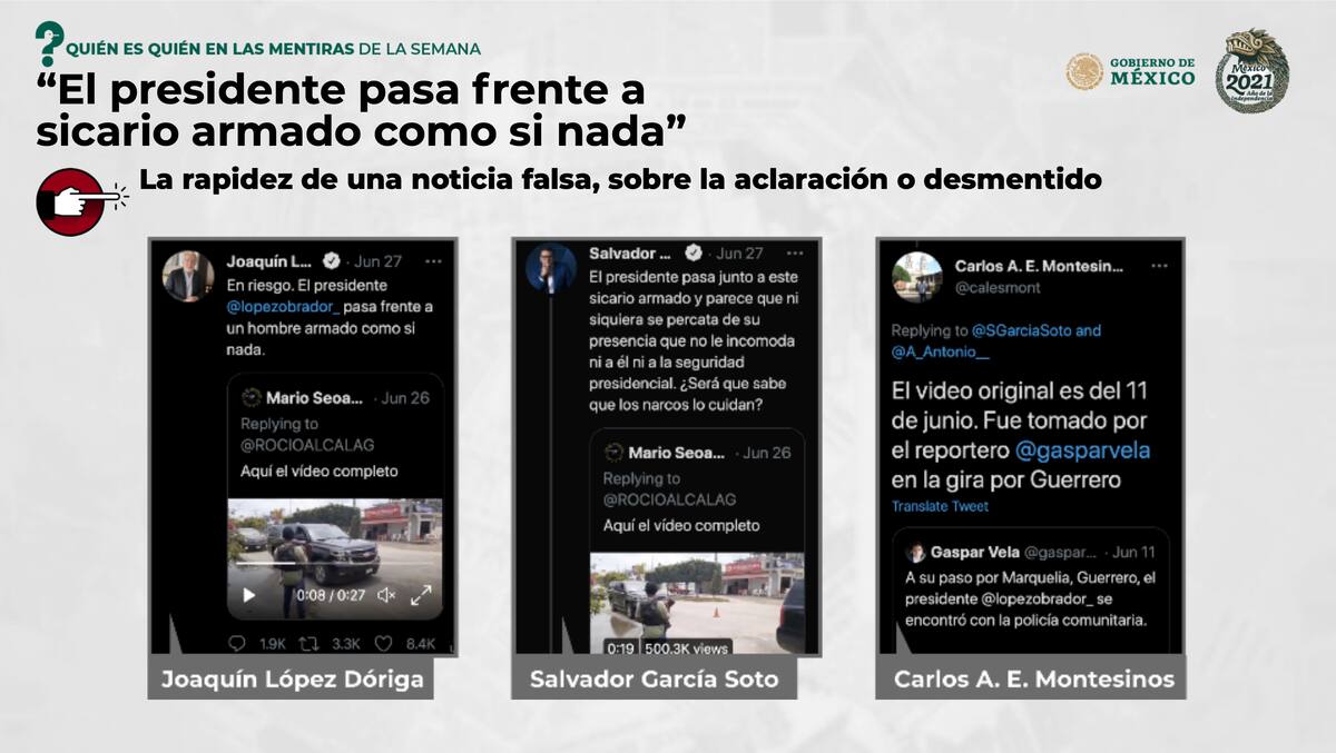 Y un video “manipulado”, de acuerdo con el Gobierno Federal, por Salvador García Soto y Joaquín López Dóriga que circuló en redes sociales : “El Presidente pasa frente a sicario armado como si nada”.