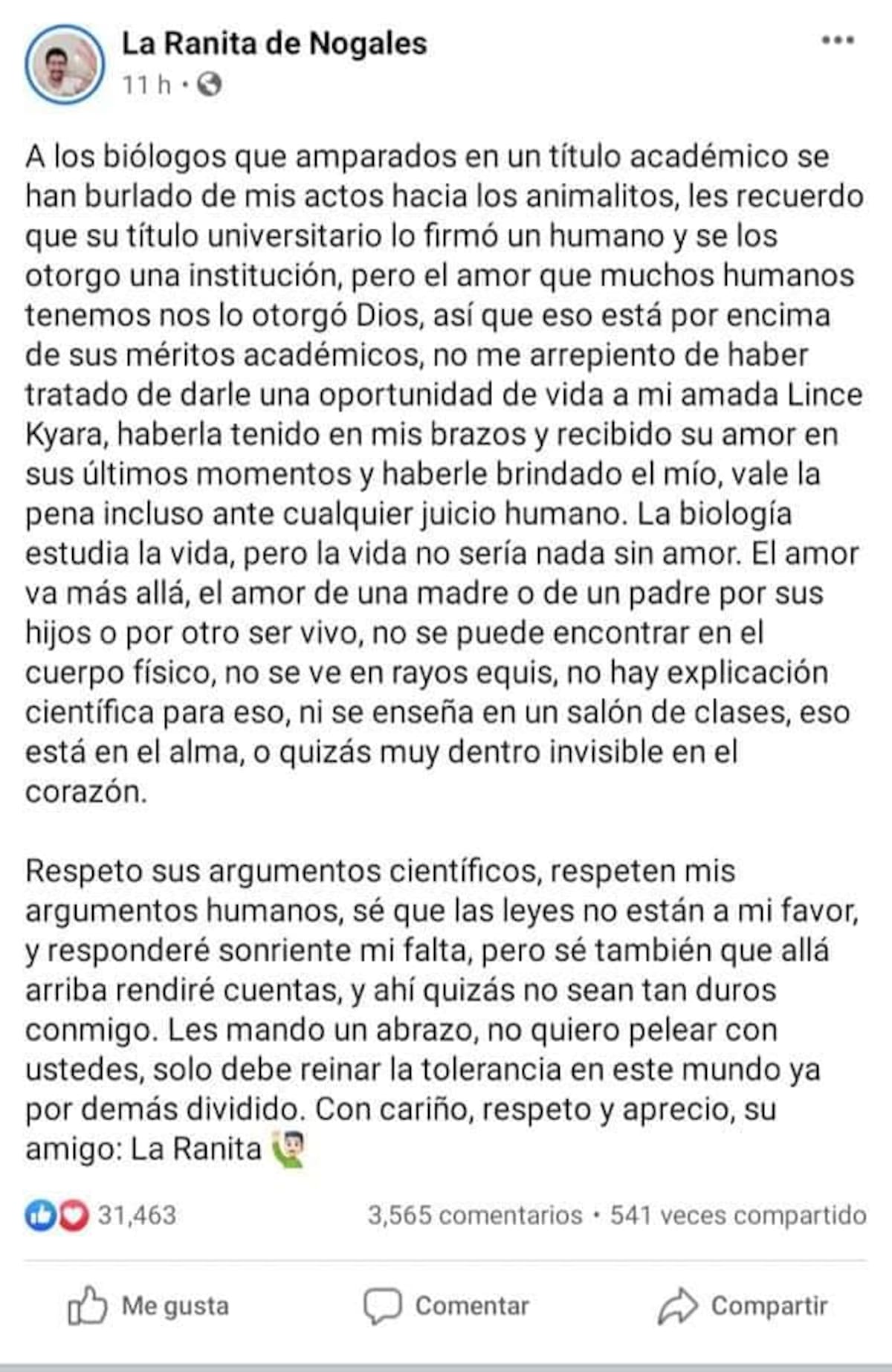 Otro de sus episodios más críticados fue el de la lince Kyara, a quien agradeció "haberla tenido en mis brazos y recibido su amor en sus últimos momentos y haberle brindado el mío", aseverando que "valió la pena incluso ante cualquier juicio humano".