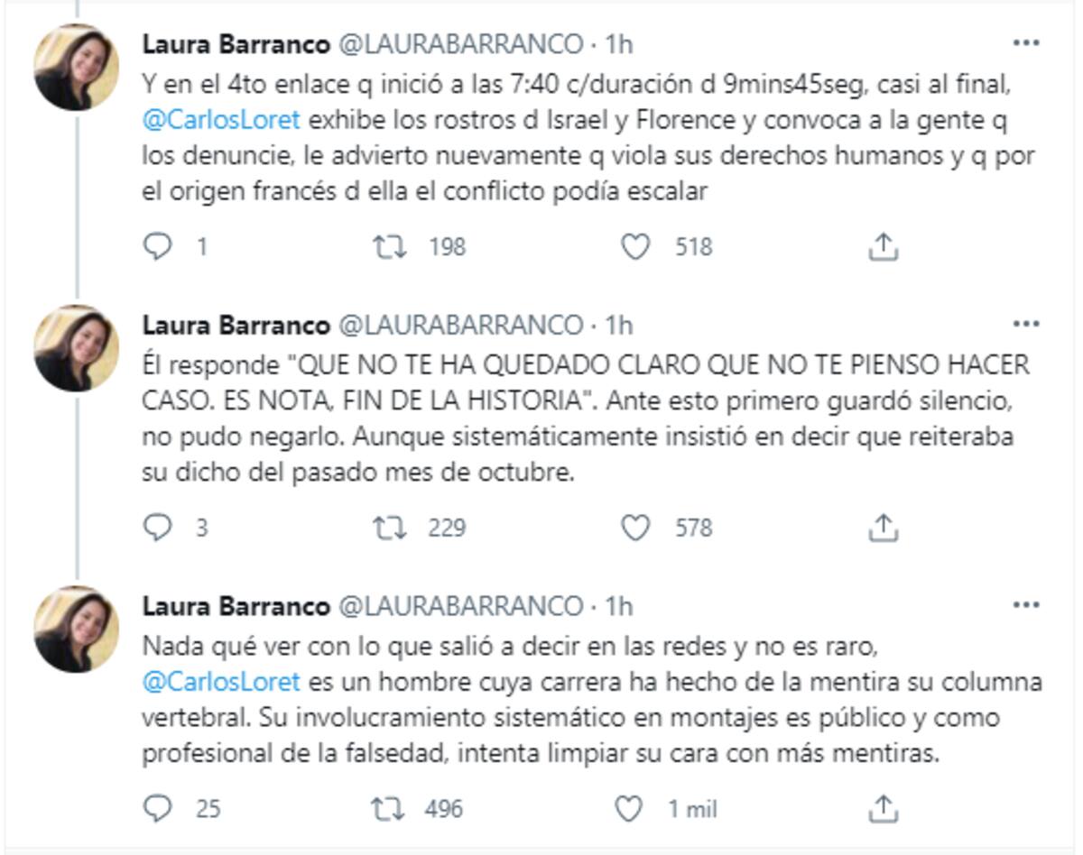 Por último tuiteó que el video que subió y difundió Loret en sus redes sociales sobre la audiencia no tuvo nada que ver a cómo se comportó en el careo, como también lo dijo Mary Sainz, esposa, lo que dijo que no es raro pues aseguró que "es un hombre que ha hecho de la mentira su columna vertebral".