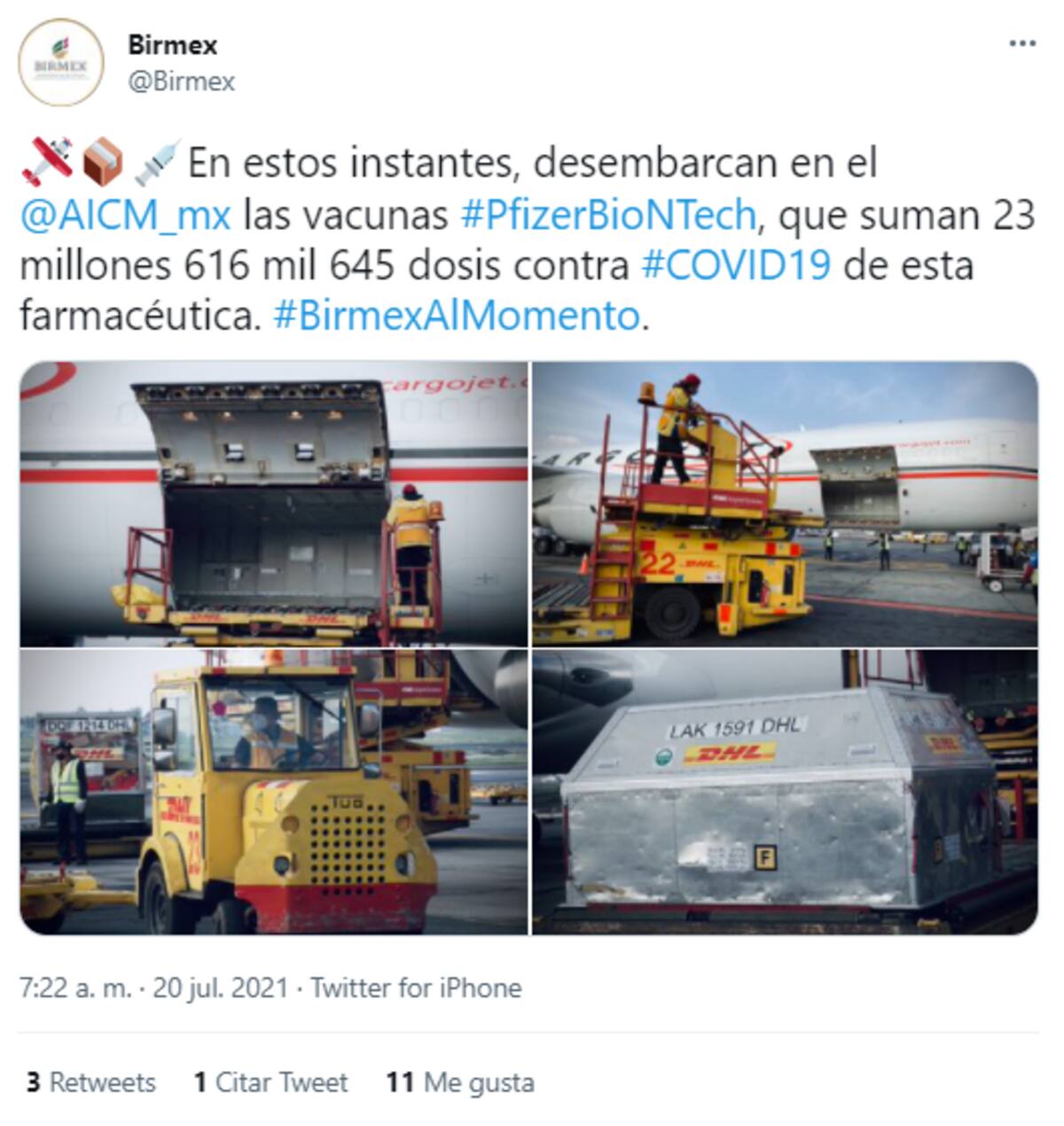 Estas dosis se suman a las llegadas unas horas antes al AICM para dar un total de 23 millones 616 mil 645 vacunas de Pfizer recibidas en territorio nacional.