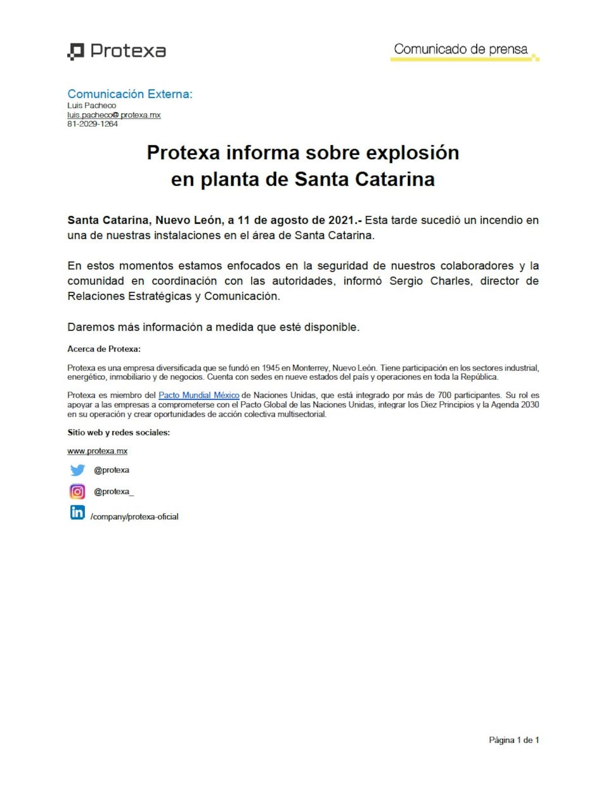 Protexa confirmó en un comunicado que "hay un incendio en sus instalaciones en Santa Catarina".