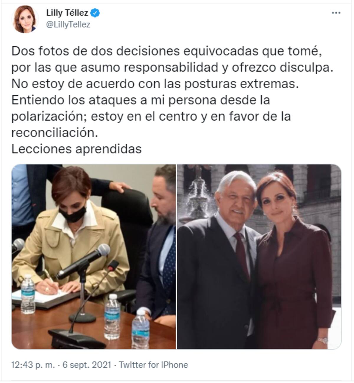 Lilly Téllez compartió dos imágenes, una con AMLO y otra firmando la carta con Vox, ambas las consideró "decisiones importantes", de las que se arrepiente.