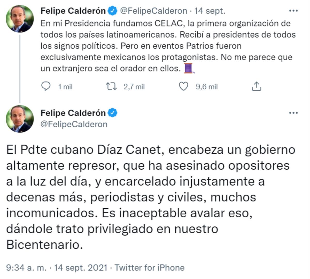 "El Pdte cubano Díaz Canel, encabeza un gobierno altamente represor, que ha asesinado opositores a la luz del día, y encarcelado injustamente a decenas más, periodistas y civiles, muchos incomunicados. Es inaceptable avalar eso, dándole trato privilegiado en nuestro Bicentenario", comentó Calderón.