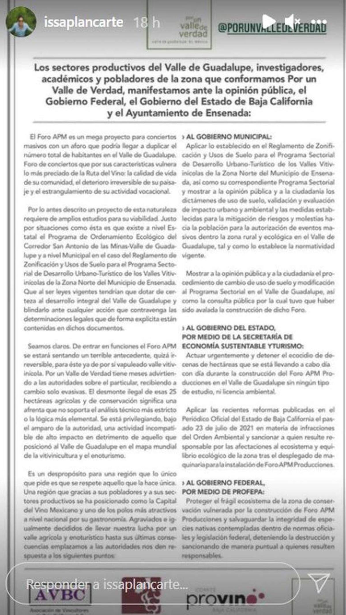 “El Foro APM es un megaproyecto para conciertos masivos con un foro que podría llegar a duplicar el número total de habitantes del Valle de Guadalupe. Foro de conciertos que por sus características vulnera lo más preciado de la Ruta del Vino: La calidad de vida de su comunidad, el deterioro irreversible de su paisaje y el estrangulamiento de su actividad vacacional”, se lee en el comunicado publicado por la periodista gastronómica Issa Plancarte y retornado por la organización en sus historias de Instagram.